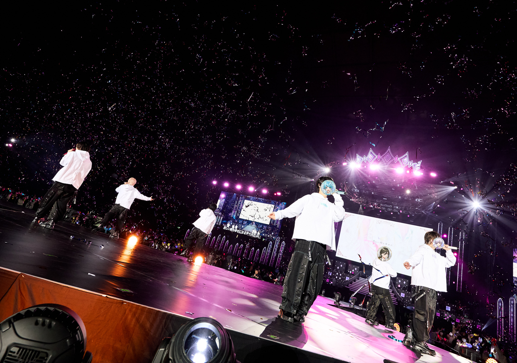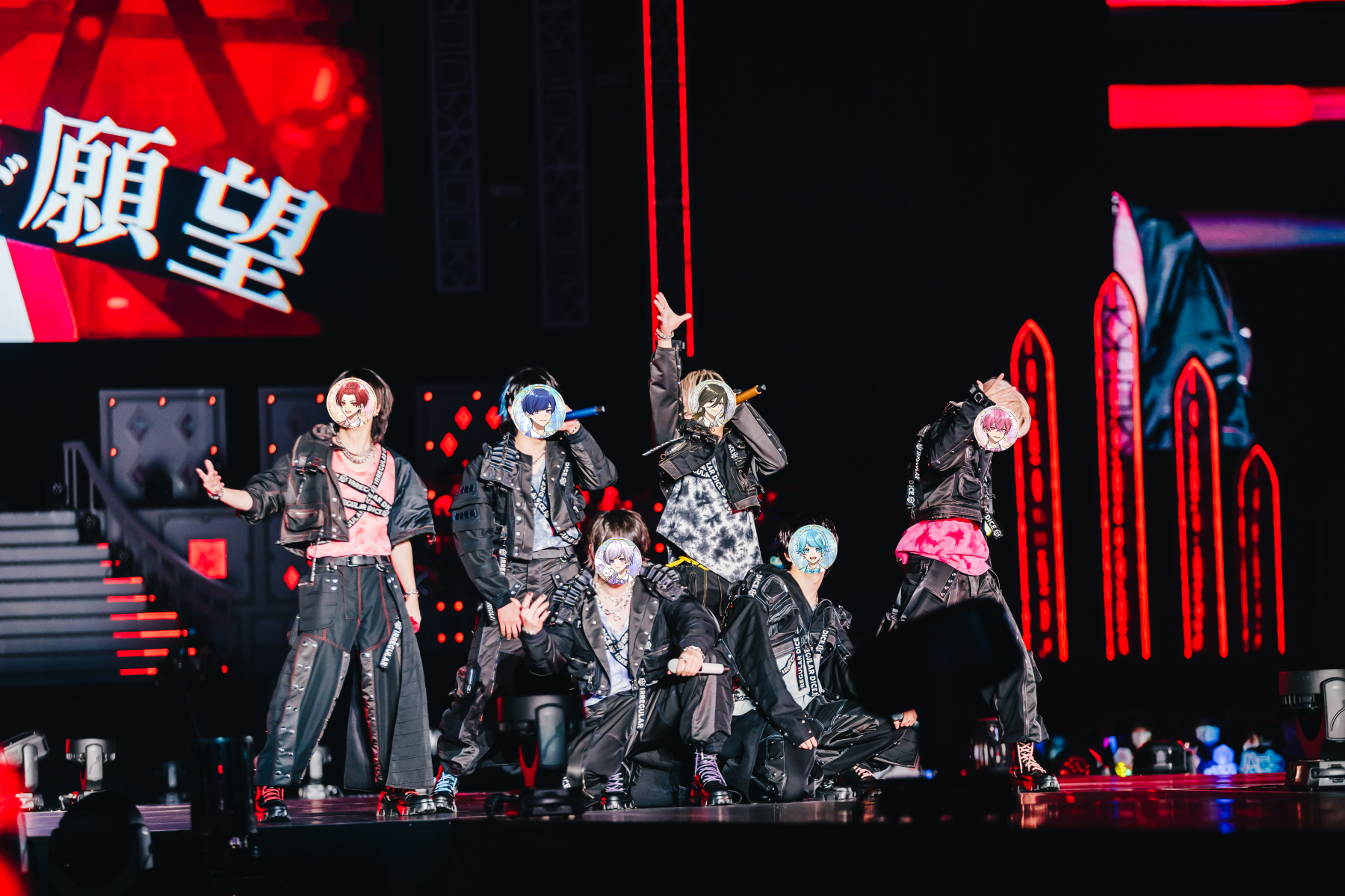 低音強めのバンドサウンドは、ラップ担当の初兎にぴったりだ。「BlanchE NeigE」の<挿し殺して>の流し目や、しなやかに舞う女性的なダンスはあまりにも艶美で、年齢制限がつきそうなほどセクシーだった。2日目もダークな世界観は健在で、「Xos」でドームを支配。がなりまじりのラップやハスキーな笑い声があまりにも刺激的で、その圧倒的な求心力は神そのものだった。