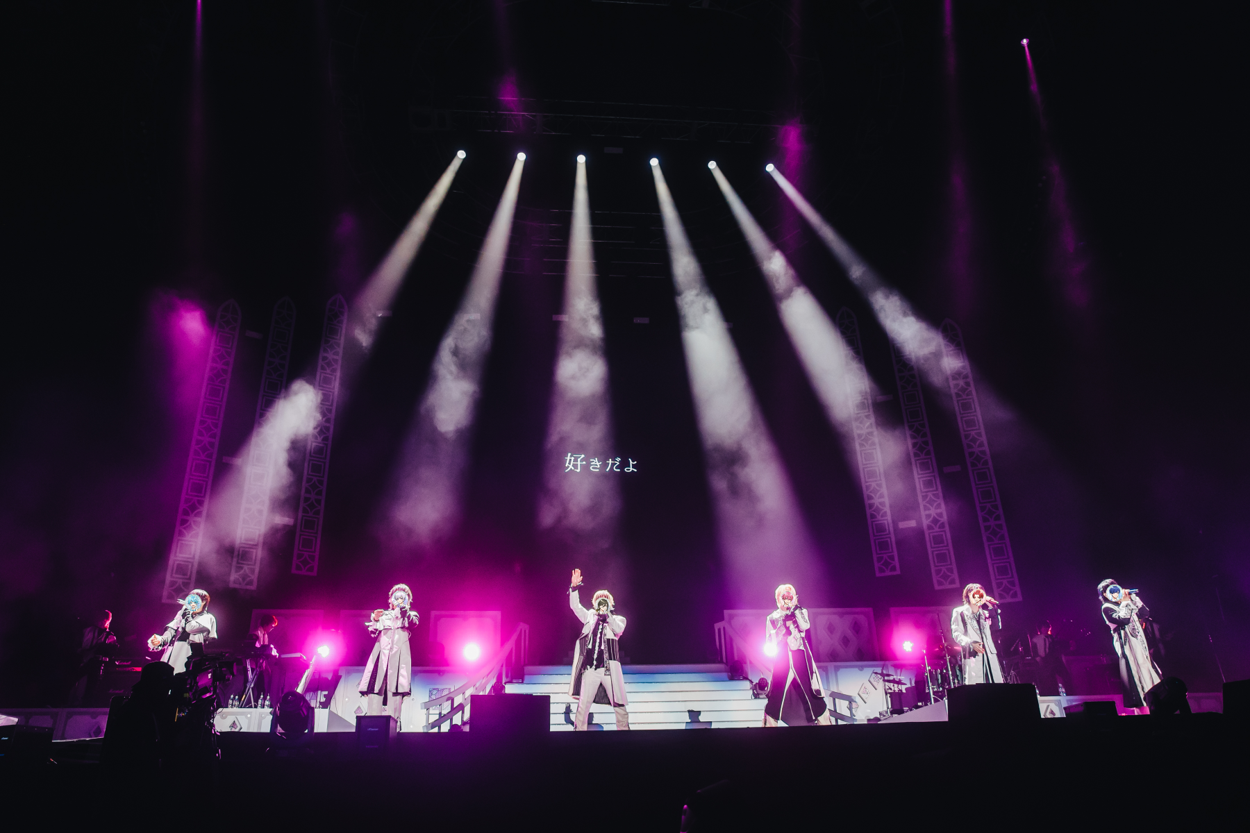 ステージ上の階段にスタンドマイクが登場し、それぞれ位置につくと「Repeat」へ。これまで激しいパフォーマンスをしていた6人が、ダンスをせずただ歌うことだけに注力したときのエネルギーもまた、圧巻のものがある。「メモリークラウン」では、作詞を担当した悠佑が「俺たちがお前らの居場所を、ずっと一生守ってやるから。俺らがライブしてる限り、これが俺らとお前らの居場所だから。それだけは忘れずにいてくれ」と語りかけた。