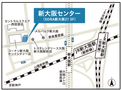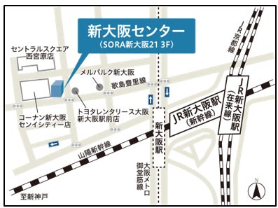 新大阪センターは、新幹線の停車駅で大阪の玄関口であるJR「新大阪」駅より徒歩7分の幹線道路(歌島豊里線)沿いに立地する視認性の高いビル「SORA新大阪21」の3階に出店いたします。
