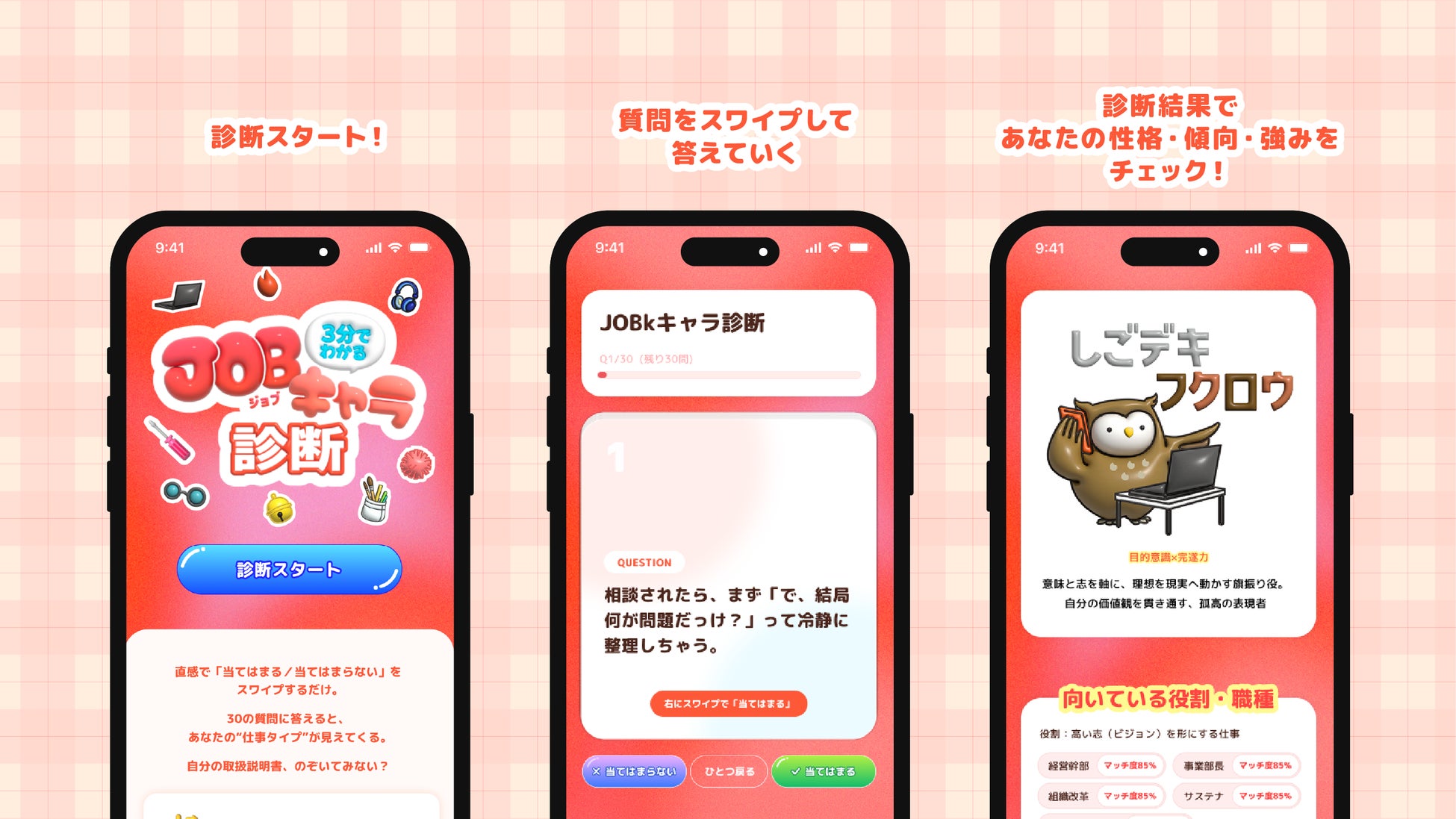 Web上で30問に答えるだけで、全8タイプの中からあなたにぴったりのキャラクターを診断。聞かれた質問を左右どちらかにスワイプするだけで簡単に答えられます。所要時間は3分で、簡単に診断することができます。