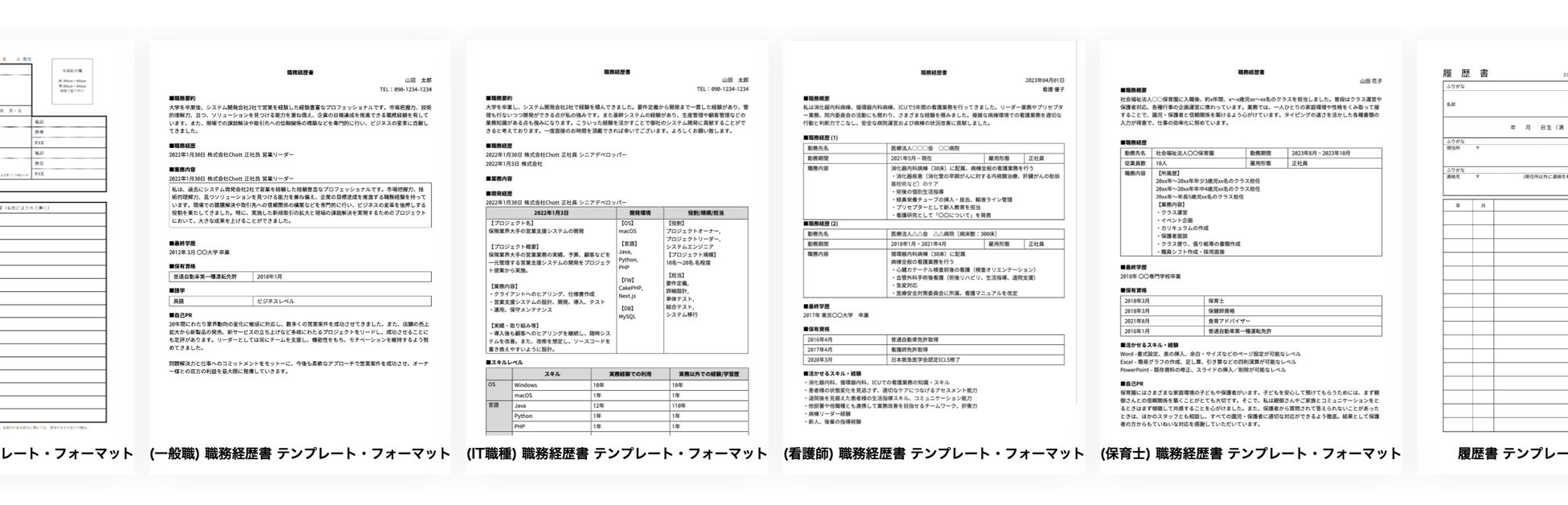 豊富な専門職向けテンプレート RESUMY.AIでは、IT職や看護師、薬剤師、保育士、営業職、マーケティング、経理などの専門職向けのテンプレートが豊富に用意されています。これにより、自分の職種に合った職務経歴書を簡単に作成することができます。