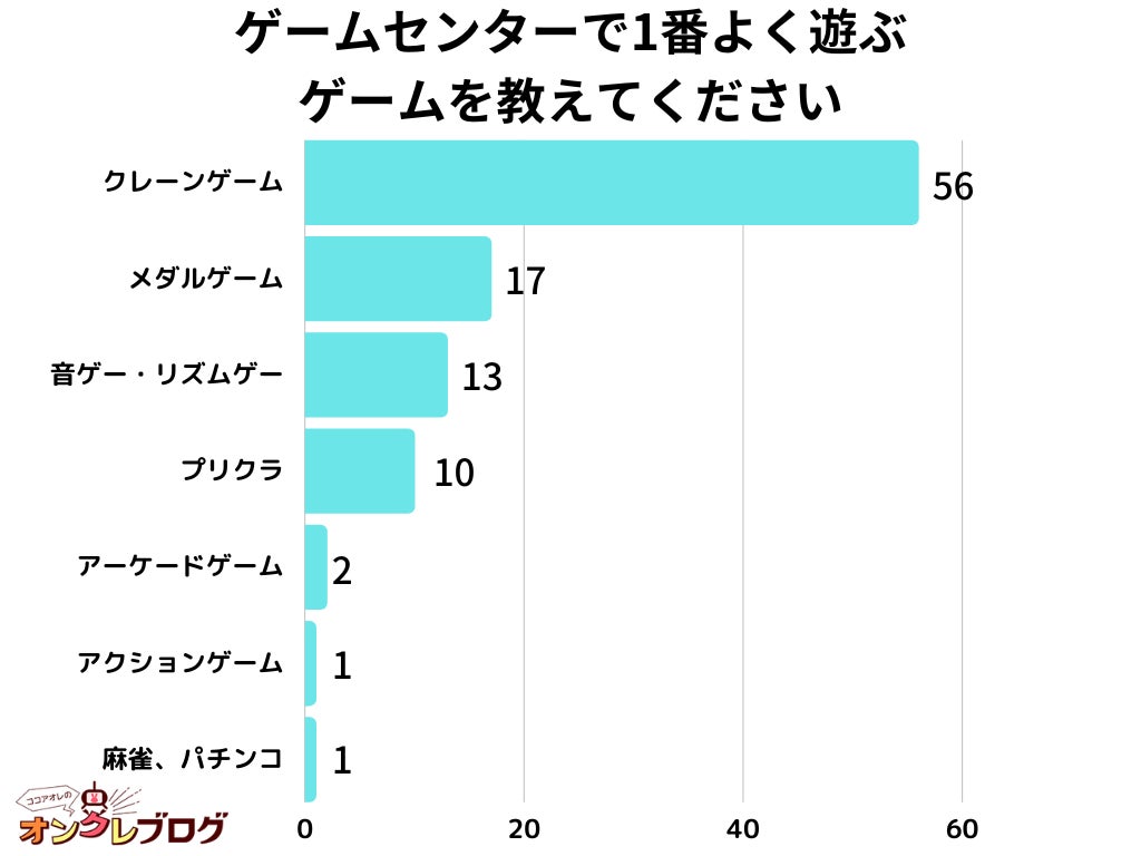 合同会社Makima(https://makima.co.jp/)が運営するゲームセンター情報メディア「ココアオレのオンクレブログ」(https://cocoaorei.work/)は、日本全国の10代以降の男女の方を対象に「ゲームセンターで1番よく遊ぶゲームを教えてください」についてのアンケート調査を実施しました。