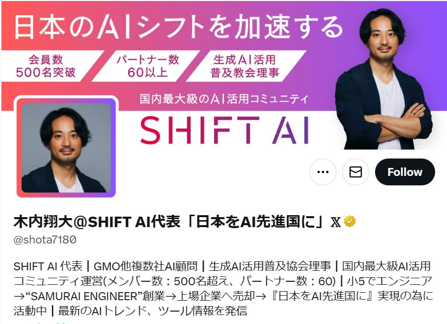 10歳でプログラミングを始めて大学時代はフリーランスエンジニアとして3年ほど活動。2013年に日本初のマンツーマン専門のプログラミングスクール「SAMURAI ENGINEER」を創業。累計4.5万人にIT教育を行い、2021年に上場企業へ売却。2022年に株式会社SHIFT AIを設立し、「日本をAI先進国に」を掲げ、AIのビジネス活用を学べる国内最大級のコミュニティ「SHIFT AI」を運営。Xを中心にSNSで6.5万人のフォロワーに向けてAI情報を発信。