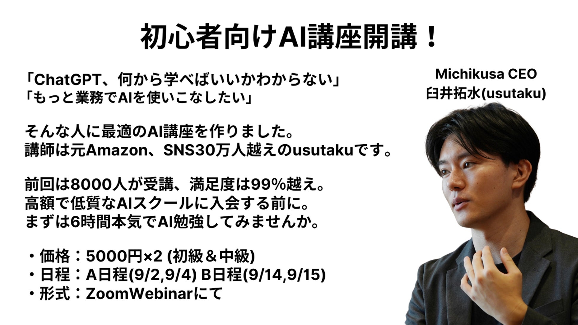 株式会社Michikusa(代表取締役:臼井拓水、東京都目黒区)は、これまで法人向けに提供してきたAI講座を、個人向けにも再度開催いたします。