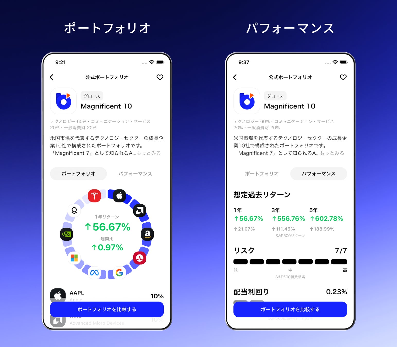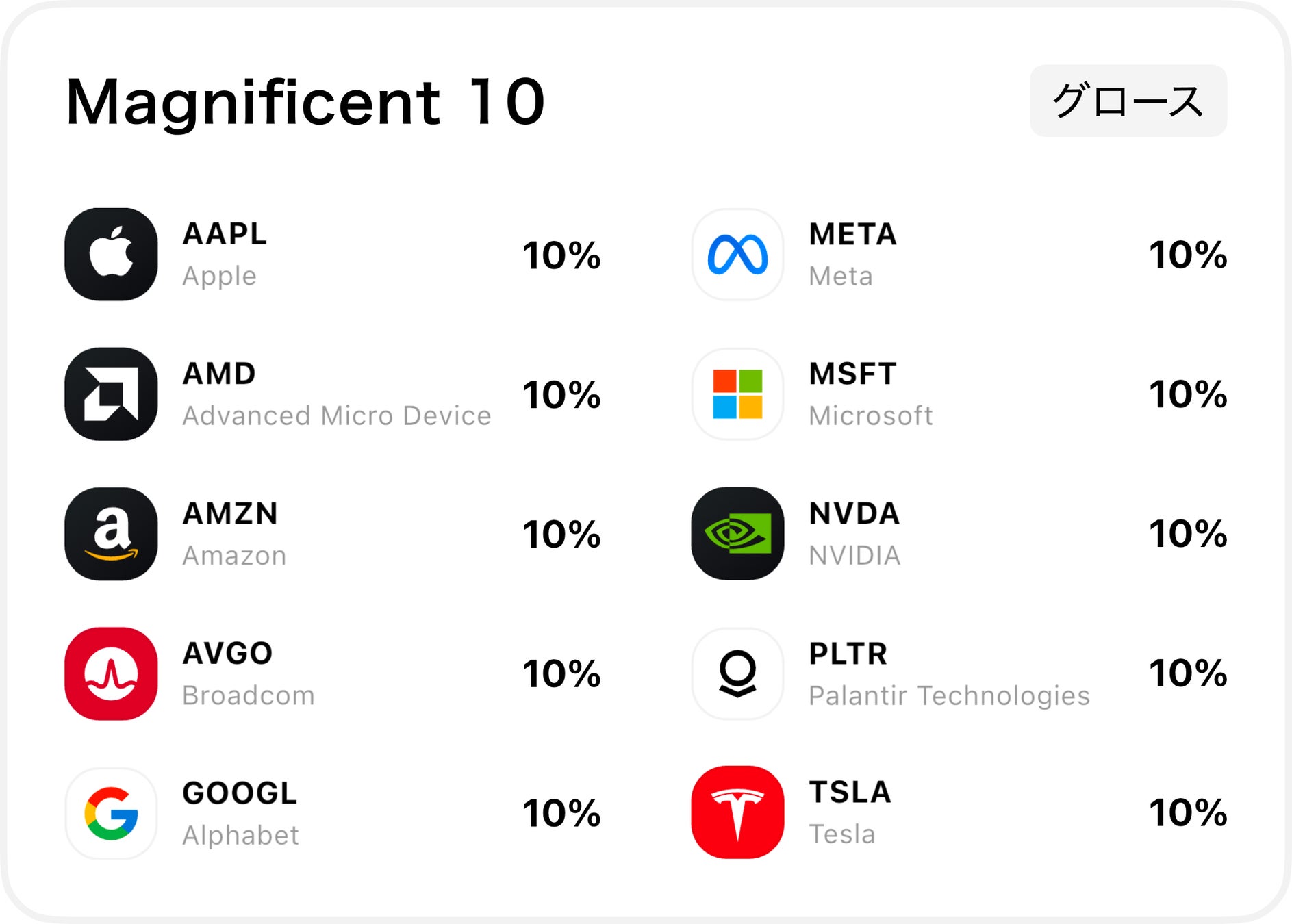 ブルーモのユーザーは、Magnificent10ポートフォリオをご自身の目標ポートフォリオにコピーいただくことで、ワンタップでMagnificent10の配分での投資が実現できます。