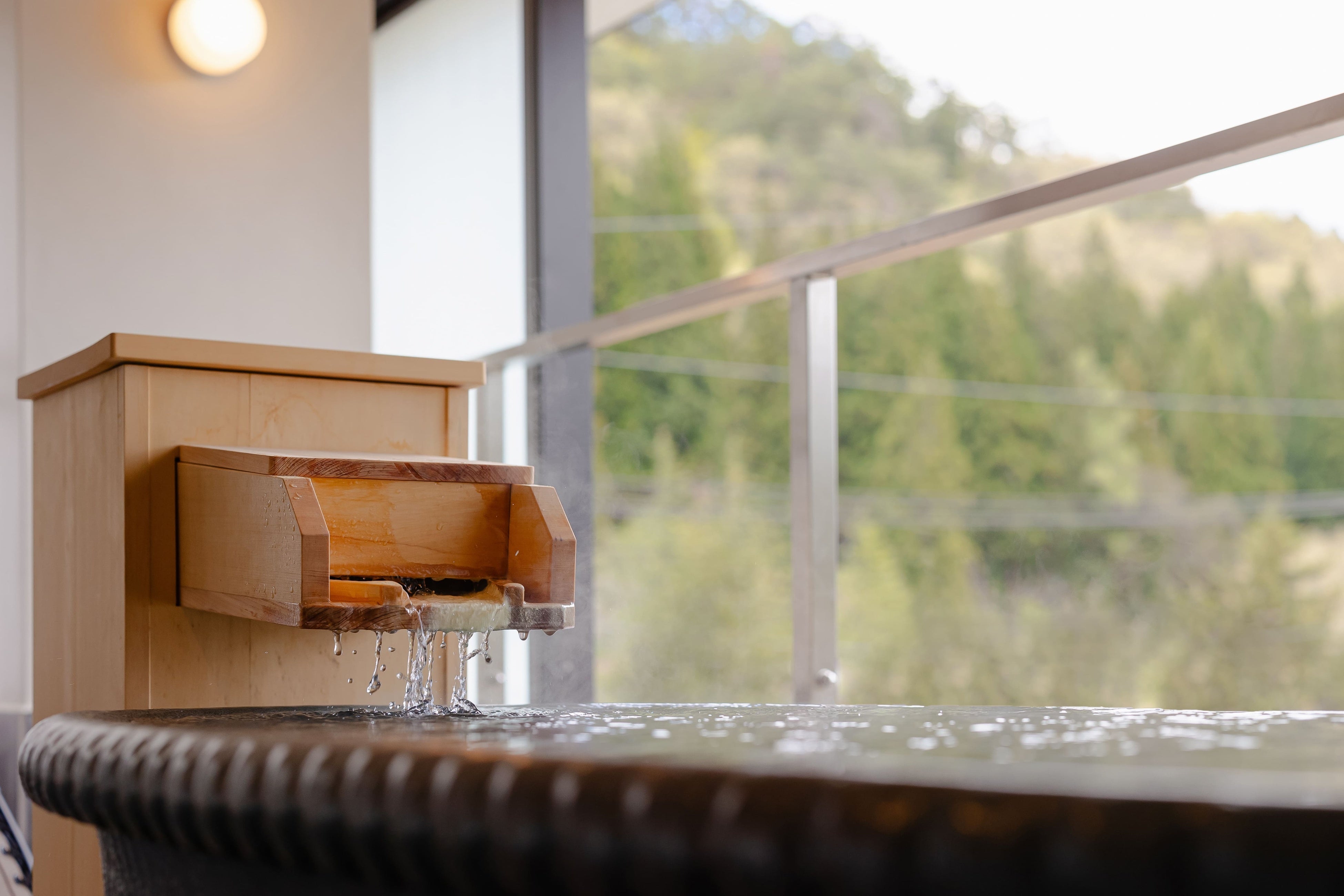 お部屋についている源泉100%かけ流しの半露天風呂をご用意しております。80°と35°の源泉をあわせ、心地の良い温度でお楽しみいただけます。お身体へのご負担を少なくするよう、1回あたり10分~15分程度でのご入浴をおすすめしており、是非チェックイン後、就寝前、翌朝の最低3回はお試しいただければ、翌日にはお肌の違いを体験していただけます。また、ご入浴中はリクライニングチェアでの外気浴もお楽しみいただけます。