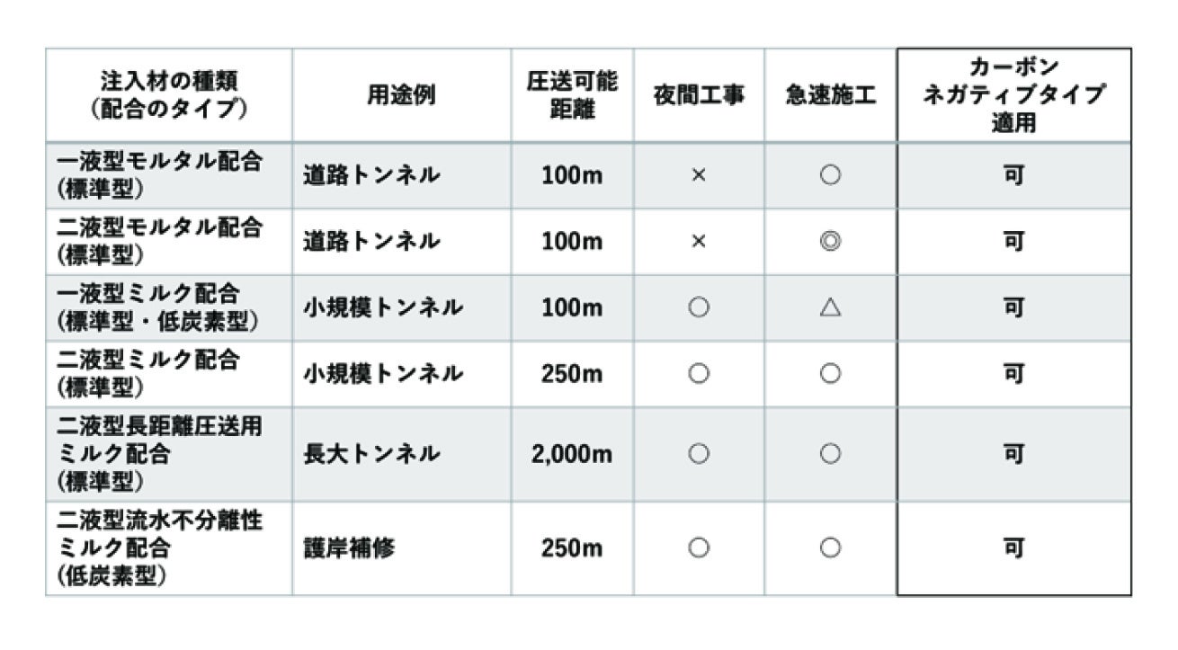 トンネル覆工裏込め注入材に必要な強度、流動性、充填性などの性能に加えて、さまざまな用途に対応した性能(長距離圧送性、流水不分離性)も確保したまま、カーボンネガティブを実現します。また、施工性にも優れており、従来と同様の方法で施工できます。