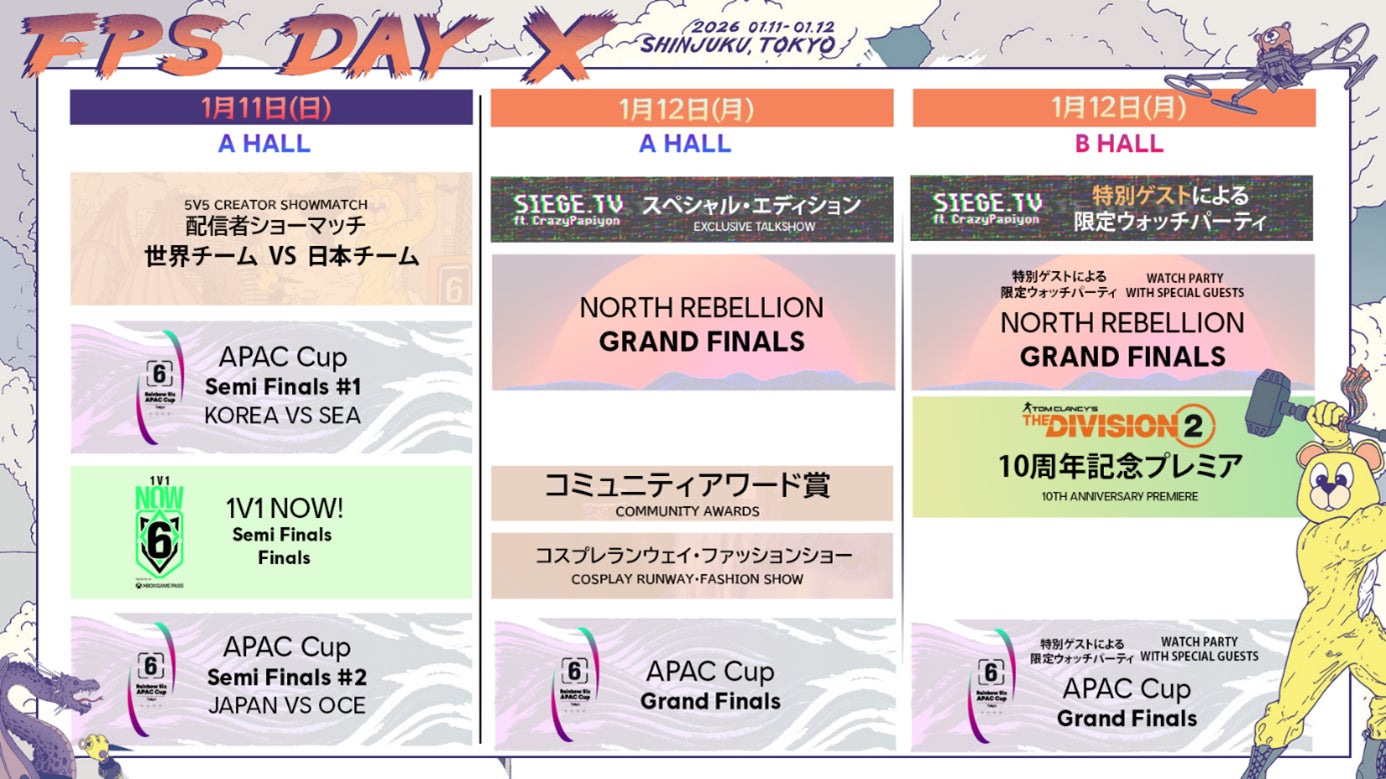 ユービーアイソフト株式会社は、当社の各種シューターゲームを堪能できるイベント「FPS Day X」を2026年1月11日 - 12日の2日間にわたって新宿・総合校舎コクーンタワーにて開催することを発表いたします。ゲーム内コンテンツが豊富に盛り込まれた、遊び心のある本イベントのキーアートは、手書きイラストをベースに作成されました。本イベントは、『レインボーシックス シージ』のAPAC地域eスポーツチームが対戦する「APAC Cup」のファイナルを実施する他、シリーズ1作目の発売から10周年を迎えた「ディビジョン」を祝福する、クリエイティブディレクターを交えての10周年記念プレミア、世界各地で予選を開催中の「1V1 NOW アジア予選 by Xbox Gamepass」、日韓大会「North Rebellion」ファイナルなどFPSタイトルに関連するステージが予定されています。また会場では、グッズの販売や各タイトルにちなんだアクティビティもご用意しています。シューティングゲームの魅力が詰まった一日を存分にお楽しみください。