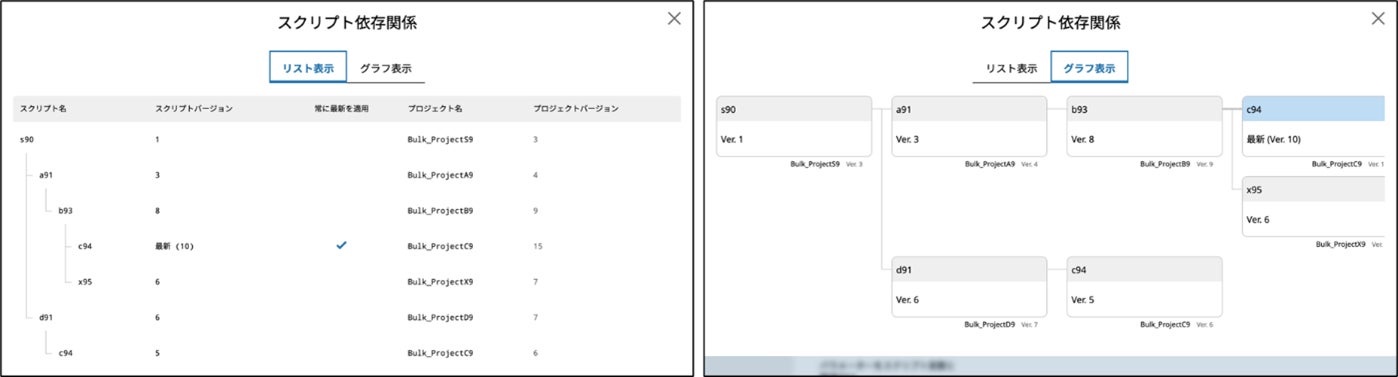 スクリプト呼び出しを多用した場合、その依存関係が複雑になったり、スクリプトのバージョン管理が煩雑になったりする場合があります。本機能を使用することで、スクリプト呼び出しの構造が可視化されます。スクリプトに対し、以下の指定ができます。