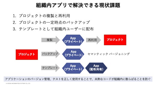 データ連携基盤や大規模開発に対応するため「アプリケーション」機能※をアップデートし、HULFT Squareのサービスの中で、開発環境からテスト環境、ステージング環境、本番環境までとシステムをリリースするまでの段階を経られるようになりました。開発環境で作成したスクリプトは、お客さま自身でプライベートの組織内アプリケーションとして登録して、テンプレートとして各環境にインストールして利用したり複製してカスタマイズして利用したりすることもできます。