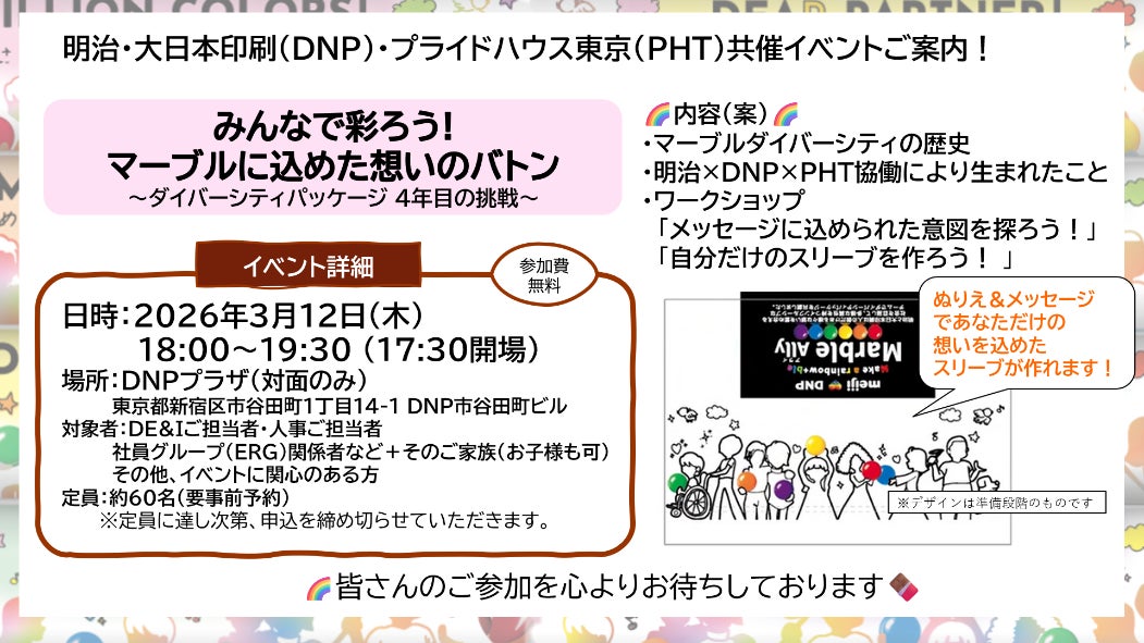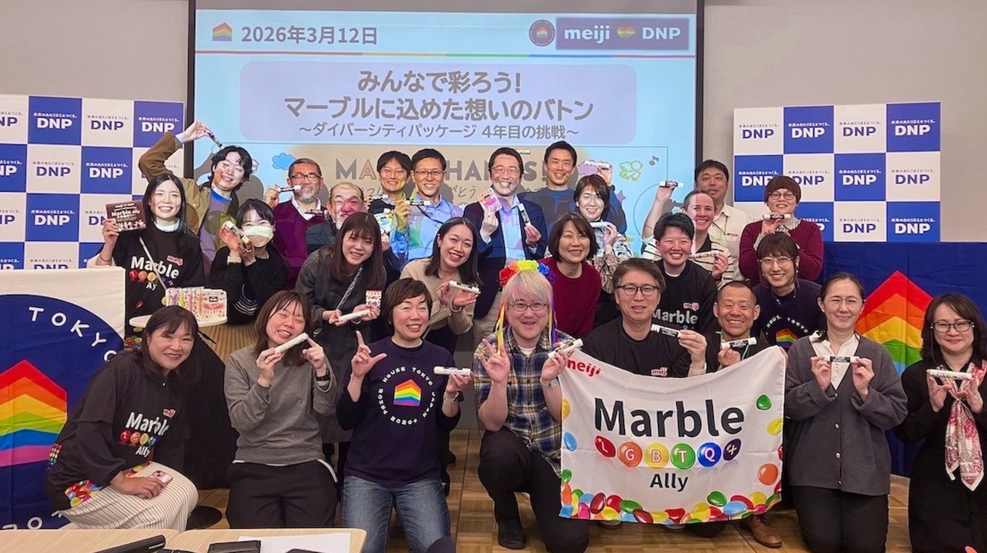 特定非営利活動法人プライドハウス東京は、株式会社 明治および大日本印刷株式会社(DNP)とともに、2026年3月12日、4年目を迎える「ダイバーシティパッケージ」を題材に、DEIをビジネスと社会の「彩り」へと広げるイベントをDNPプラザにて開催しました。