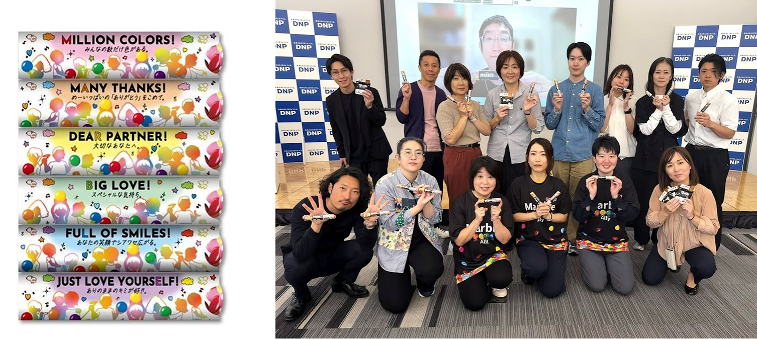 明治のカラフルな小粒チョコレート「マーブル」の限定パッケージ「マーブル ダイバーシティ」の新デザインが共同企画され、障がいのあるDNPグループ社員が制作したイラストが採用されました。複数のパッケージをつなげることで、人々が想いをバトンのように受け渡す姿が表現されており、多様なつながりを象徴するデザインとなっています。