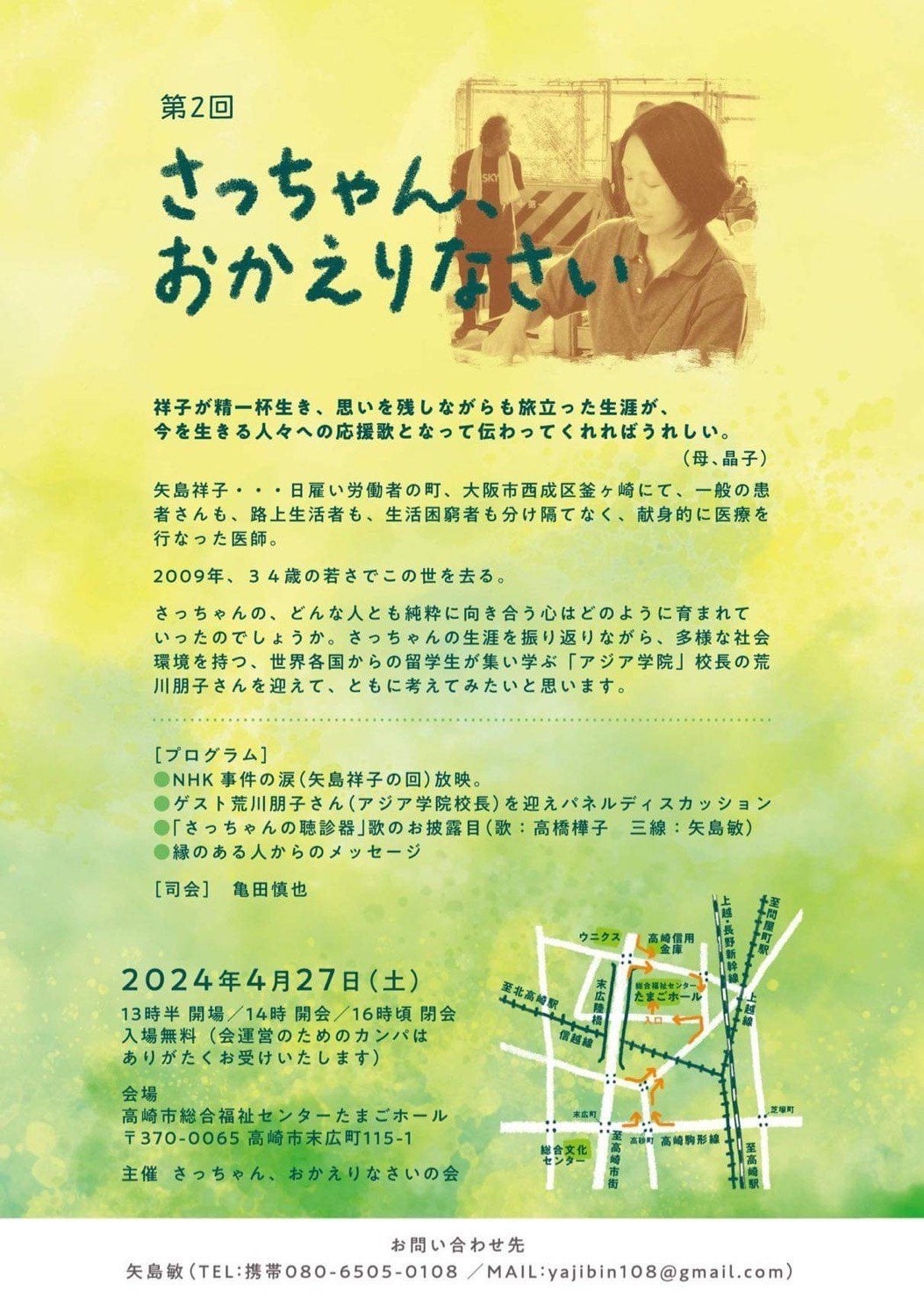 "Satchan, welcome back" is an event about Sachiko Yajima, a doctor in Kamagasaki.