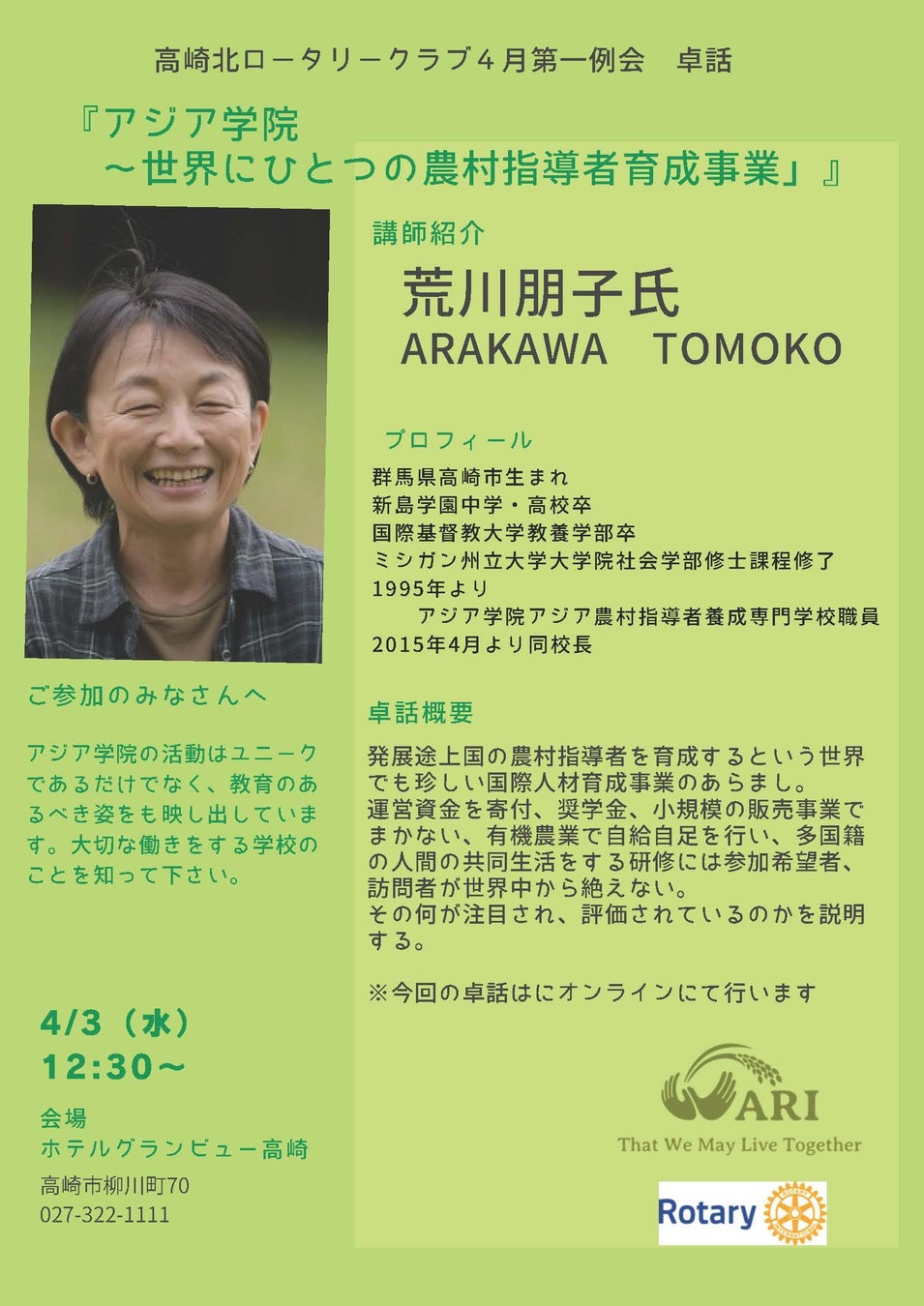 Arakawa will also speak on "Asian Rural Institute - One World Rural Leaders Training Project" at the Takasaki Rotary Club meeting tomorrow, Wednesday, April 3.