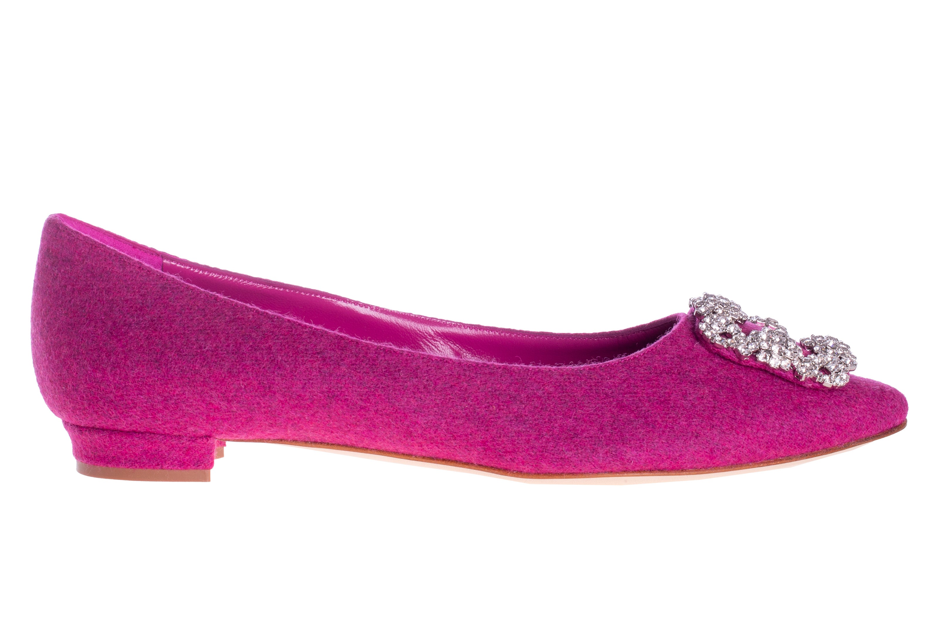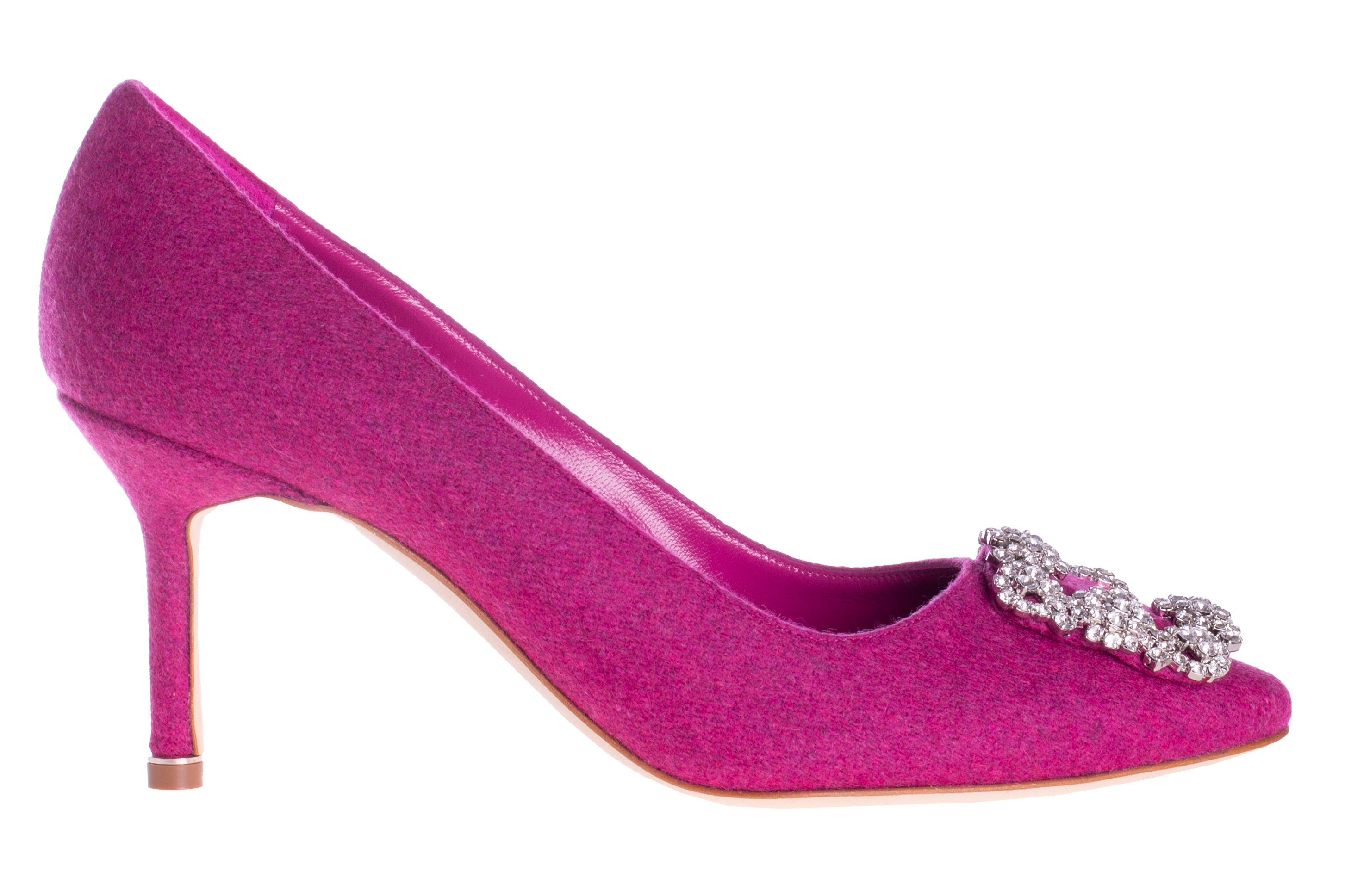 英国へのリスペクトからツイードをこよなく愛するマノロ・ブラニクは、今シーズンスコットランドのヘブライダンツイードでハンギシを更新しています。フューシャピンクとソフトなグレーにクリア・クリスタルのバックルが印象的な仕上がりです。