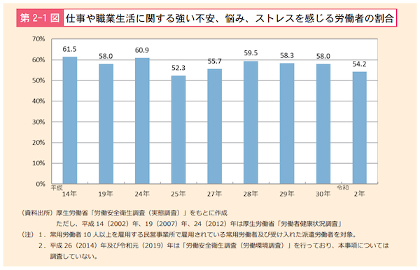 厚生労働省が実施した「労働安全衛生調査(実態調査)」によると、仕事や職業生活に関する強い不安、悩み、ストレスを感じる労働者の割合は、常に調査対象の半数を超えています。