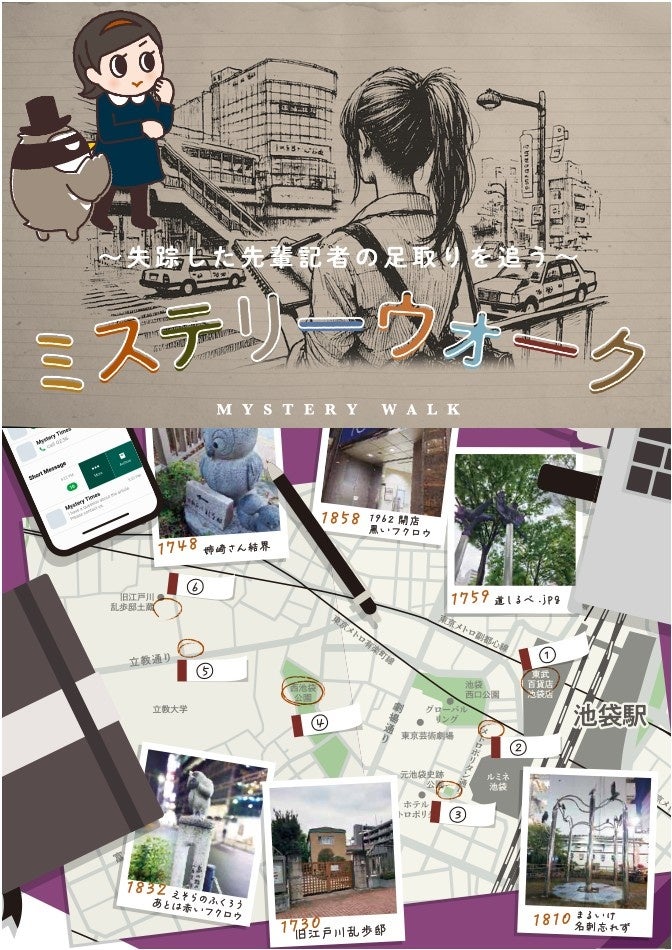 池袋に点在するふくろう像には、ある順番に巡ると行方不明になるという都市伝説が。実際に行方不明になってしまった新聞記者の足取りを追い、真相解明に挑むウォーキングアトラクションです。