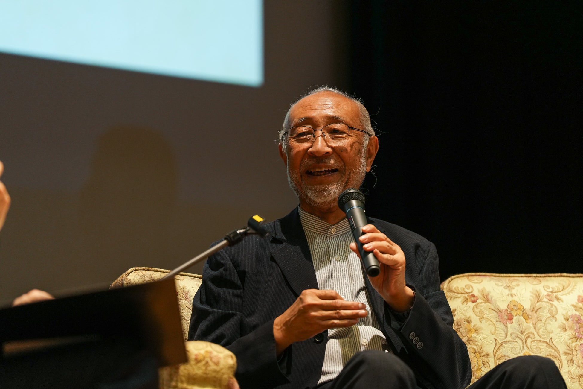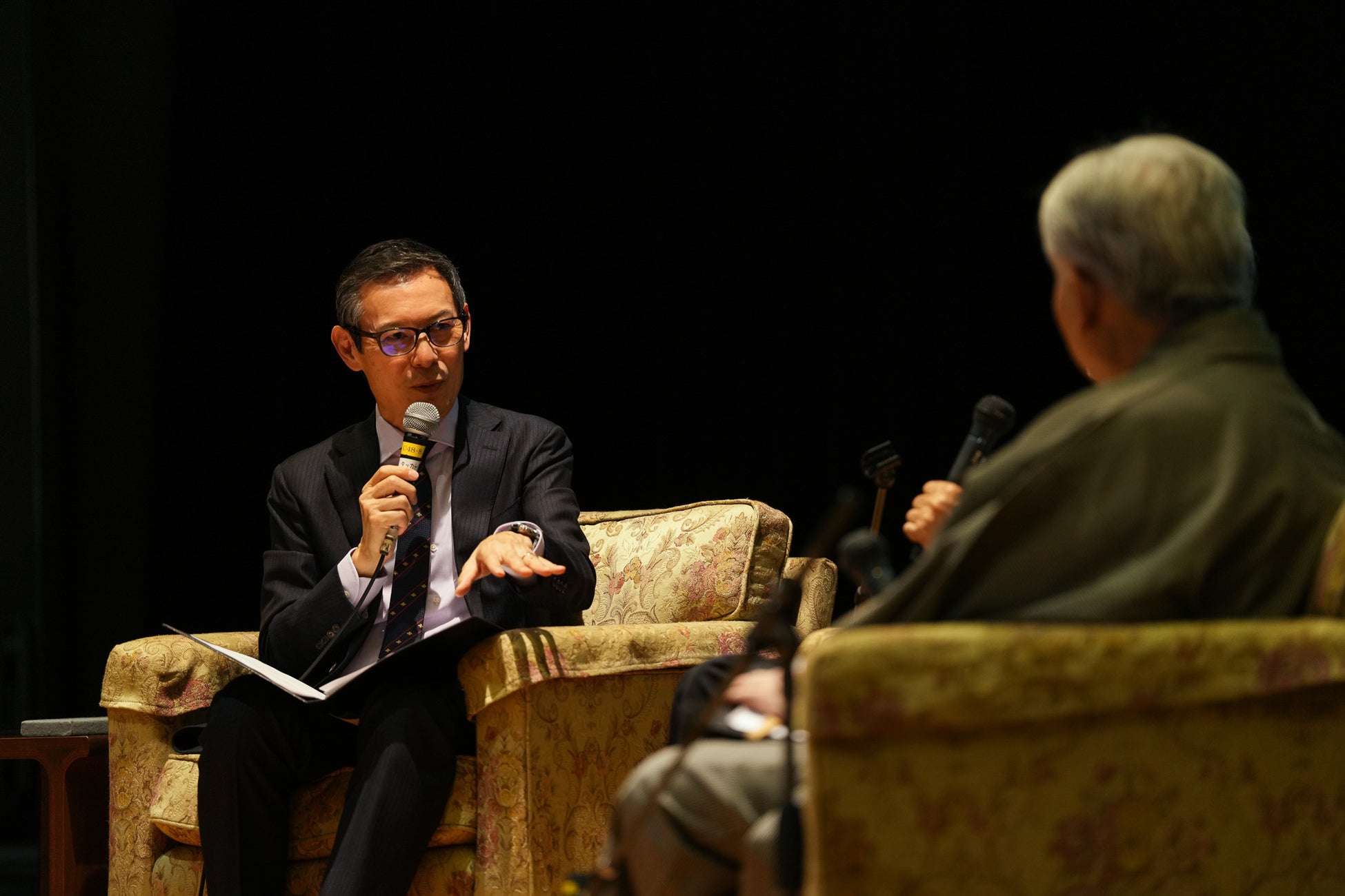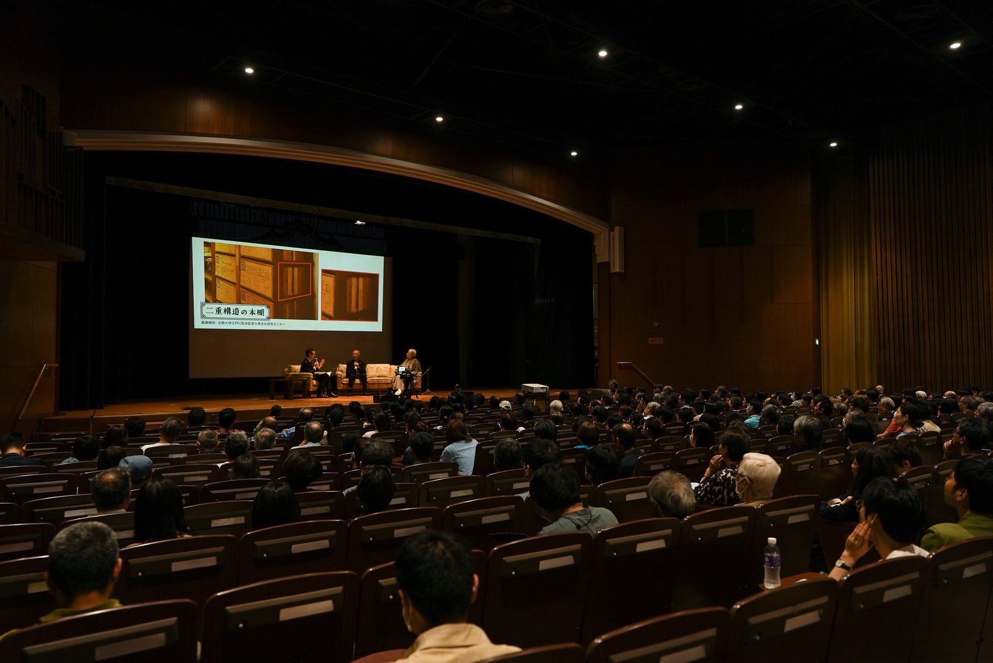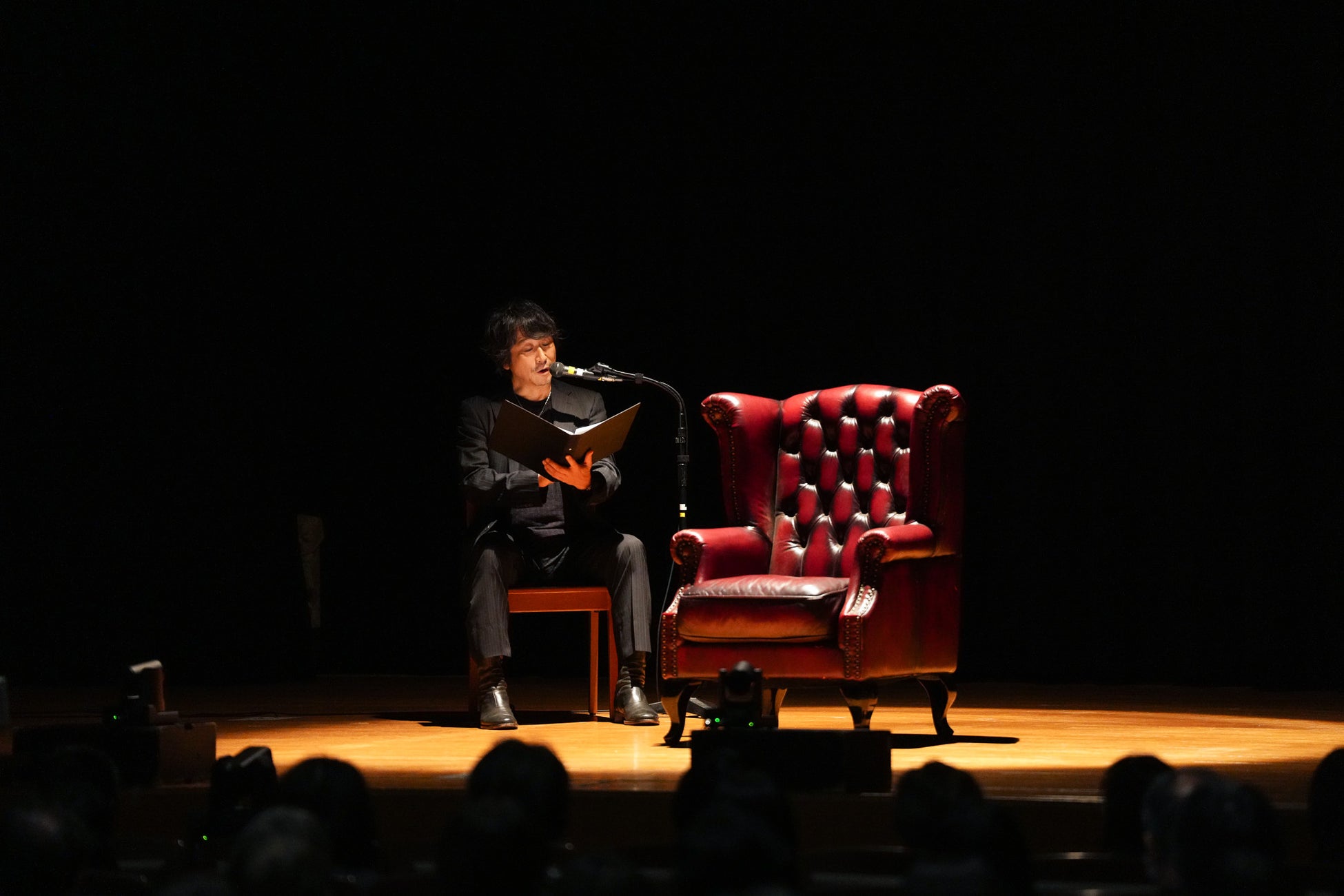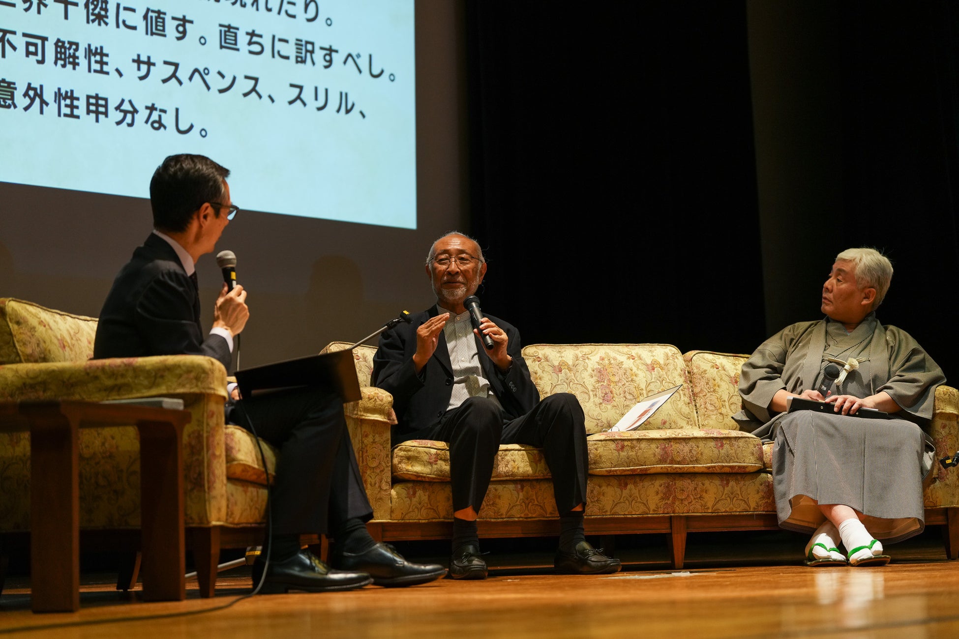 立教大学が管理する旧江戸川乱歩邸の土蔵には、乱歩が蒐集した蔵書が今も収められています。そんな“作家の思考のかけら”を手掛かりにしながら、乱歩のご令孫である平井憲太郎さんと落語家・柳家喬太郎師匠が思い出話を交えた乱歩トークを展開。タッカーホールに集まった観客は熱心に耳を傾けていました。声優・東地宏樹さんによる乱歩の代表作『人間椅子』の朗読も上演されました。