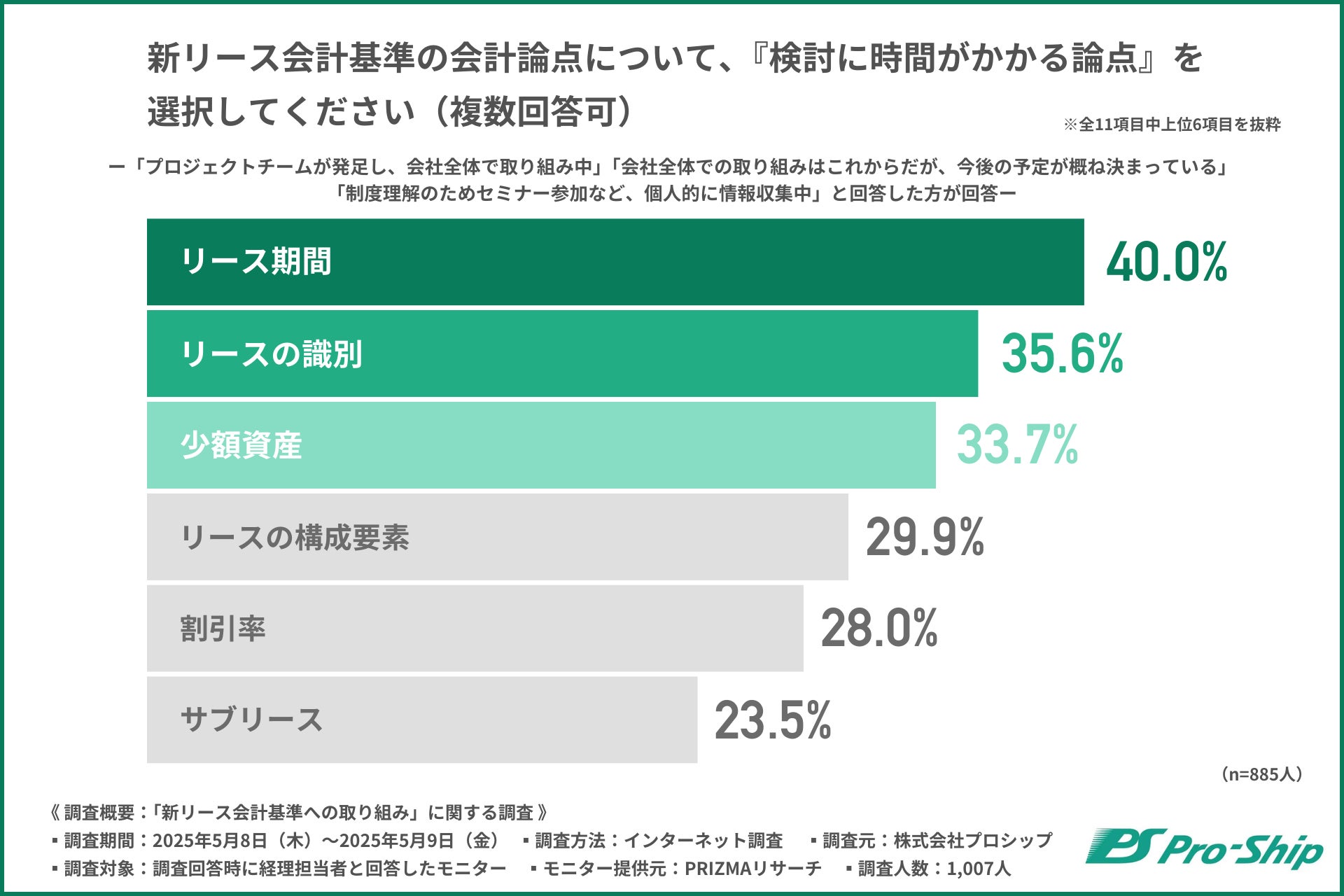 次に、「適用準備が進んでいる」と回答した方に、「検討に時間がかかる会計論点」について尋ねたところ、『リース期間(40.0%)』『リースの識別(35.6%)』『少額資産(33.7%)』が上位に挙がりました。