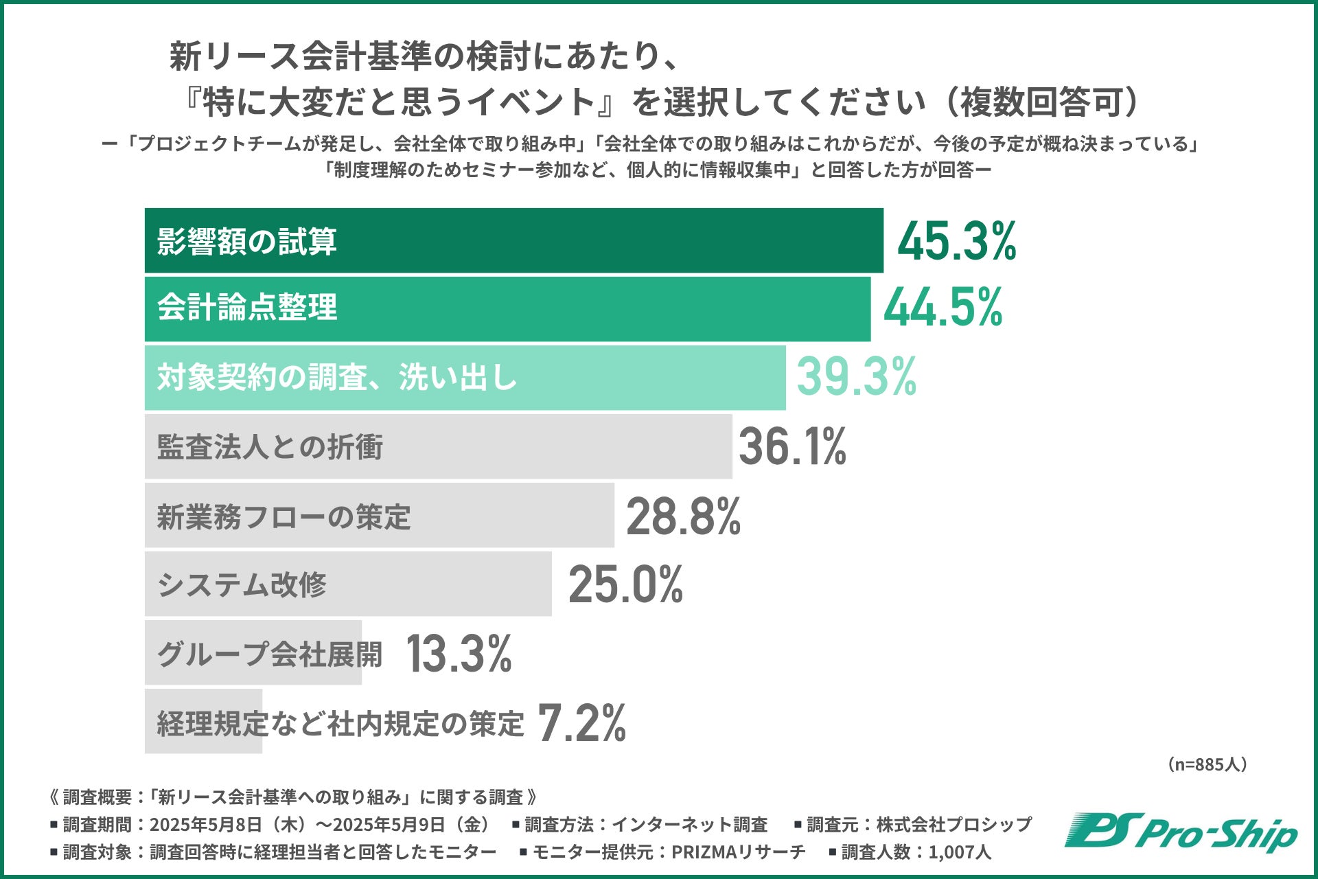 「新リース会計基準の検討にあたり、『特に大変だと思うイベント』」について尋ねたところ、『影響額の試算(45.3%)』『会計論点整理(44.5%)』『対象契約の調査、洗い出し(39.3%)』が上位に挙がりました。