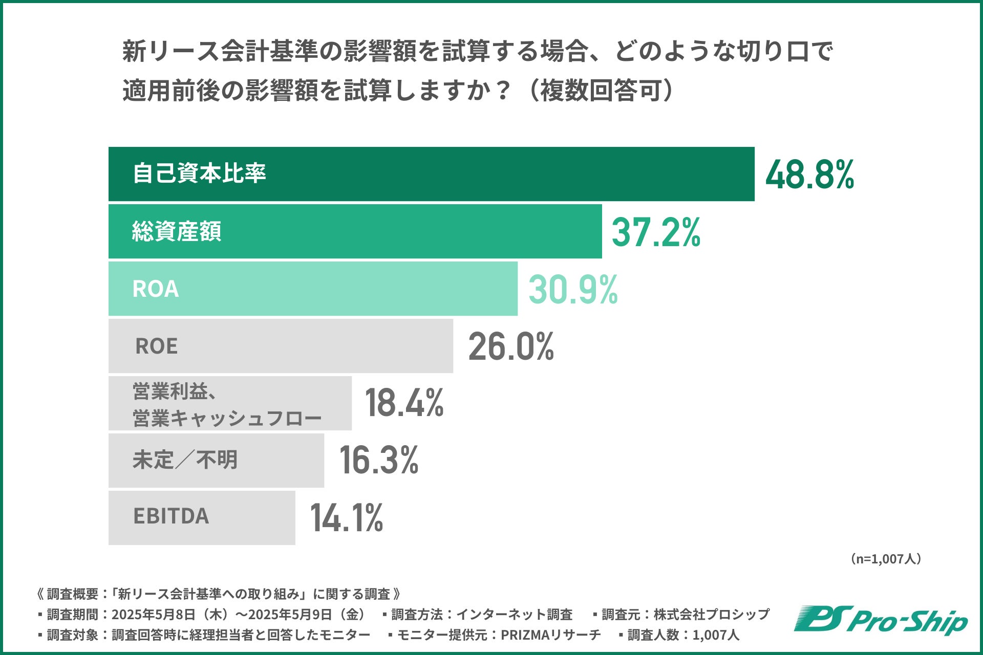 「新リース会計基準の影響額を試算する場合の切り口」について尋ねたところ、『自己資本比率(48.8%)』が最多で、『総資産額(37.2%)』『ROA(30.9%)』と続きました。