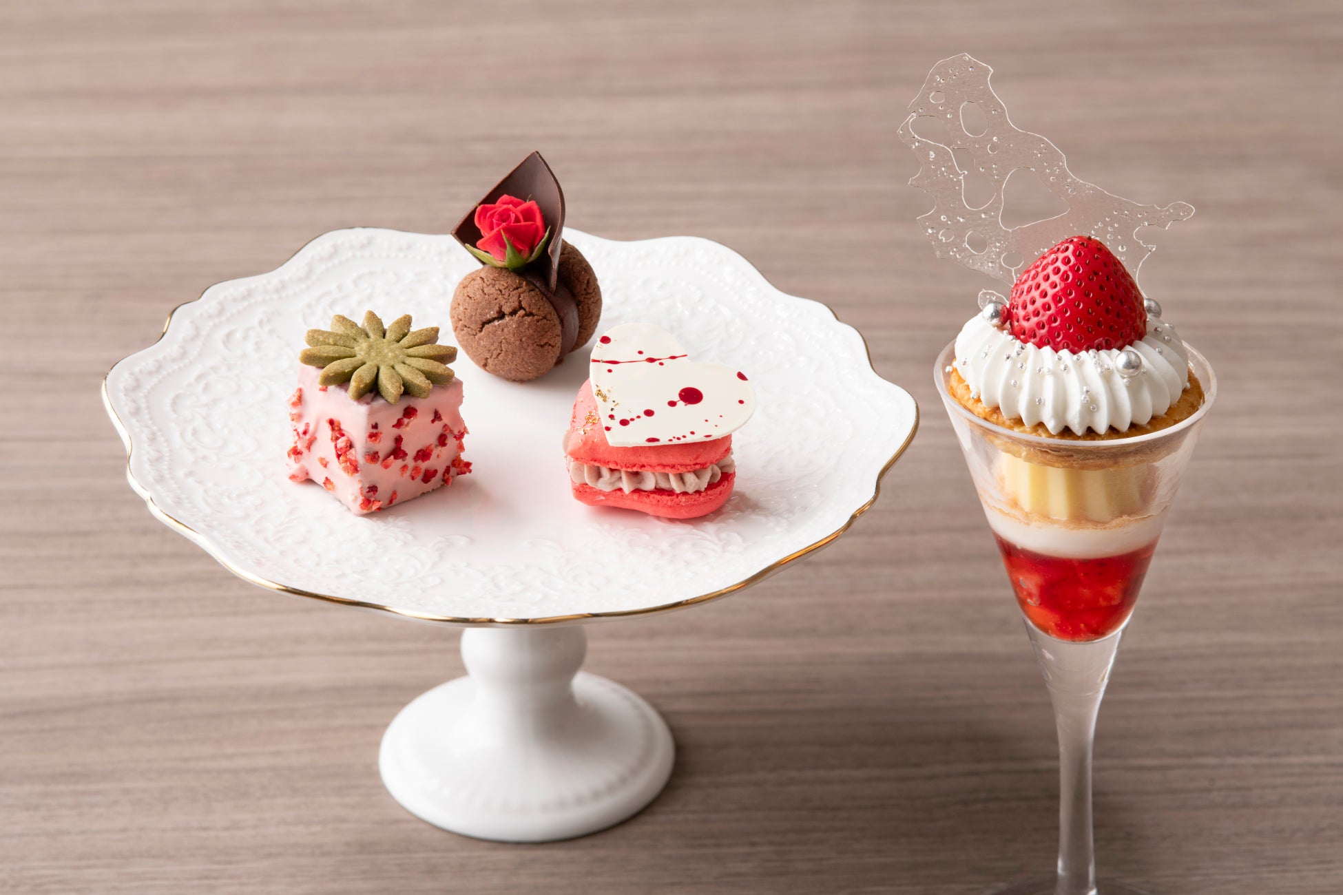 ハート型のルビーチョコレートマカロンやピスタチオとクルミ入りのケークサレなど全14種「ストロベリー×チョコレートアフタヌーンティー」2025年1月29日(水)からスタート