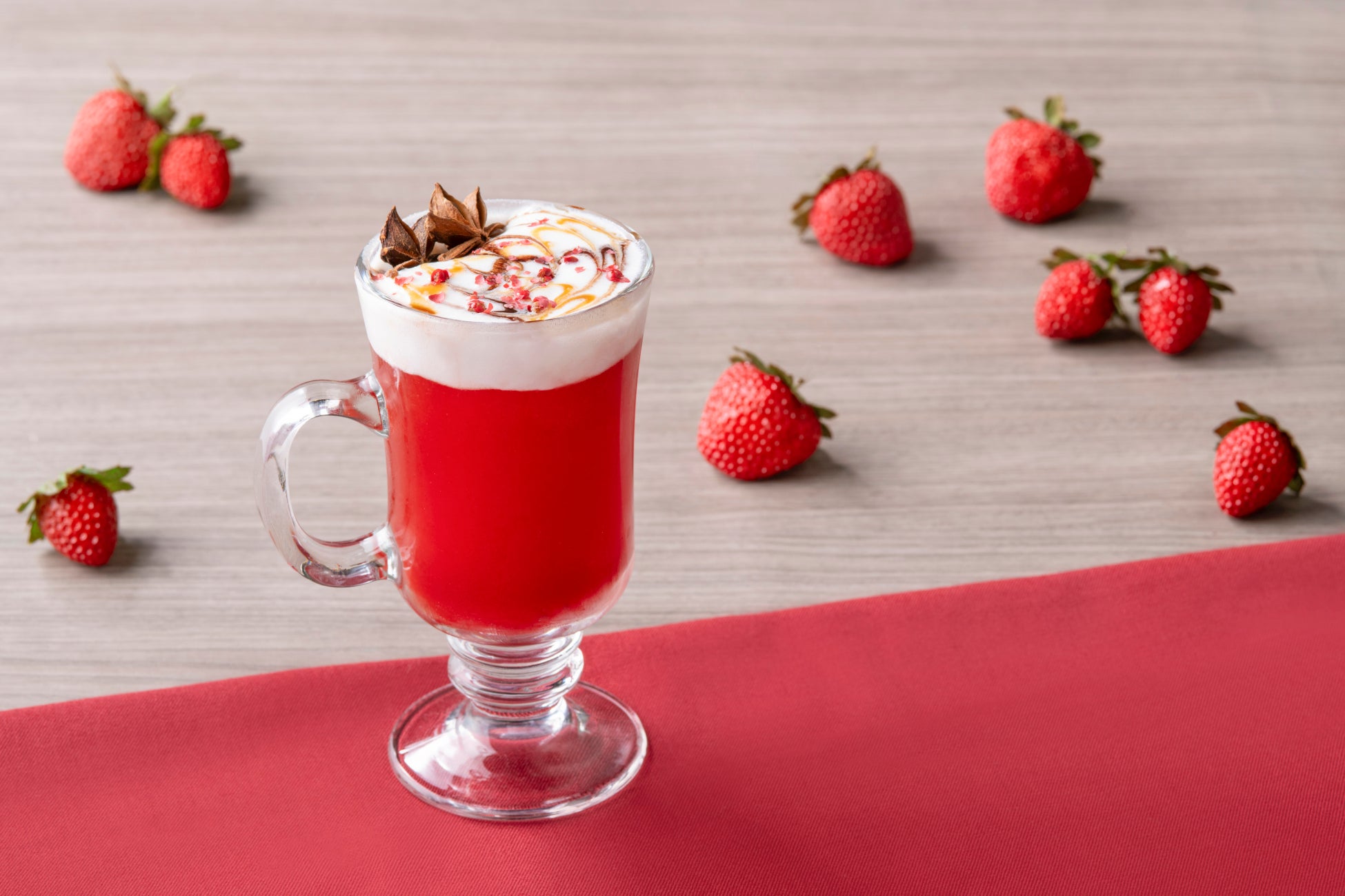 ストロベリーピューレ、柑橘系の香り豊かな「Dilmah(ディルマ)」の「オリジナル・アールグレイ」、スターアニスやシナモン、バニラシロップ、バターなどを合わせて、深みのある味わいにスパイスが加わった魅力的なホットモクテルです。冷たいミルクフォームと温かいドリンクとの温度の違いで変わる風味や、ミルクの表面にあしらったチョコレートソースとキャラメルソースの甘味など、ひとつのドリンクから様々な味わいをお楽しみください。
