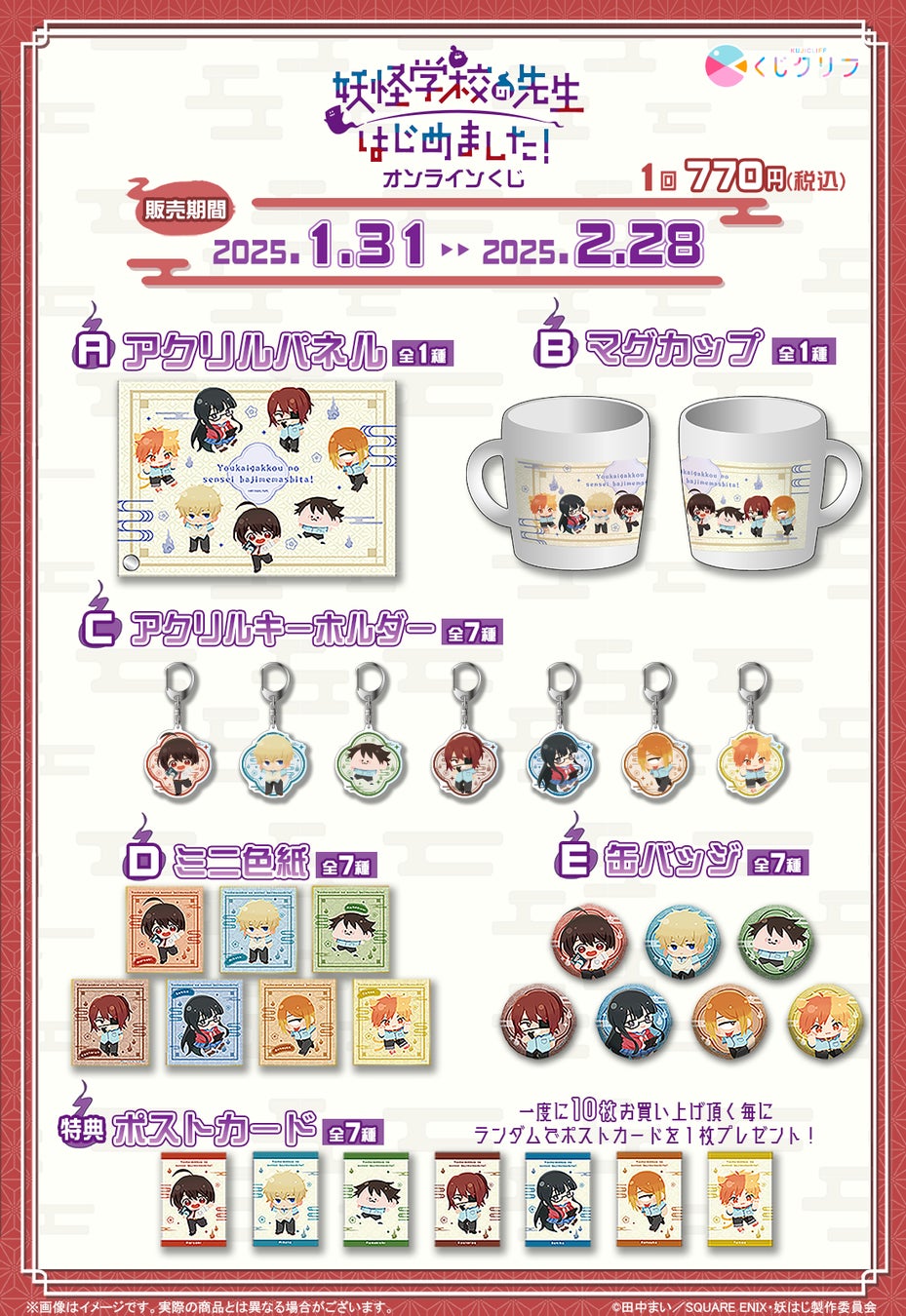 くじクリフにTVアニメ『妖怪学校の先生はじめました!』のくじが新規描き起こしで登場🎉ここでしか手に入らない限定グッズが1月31日より販売開始!