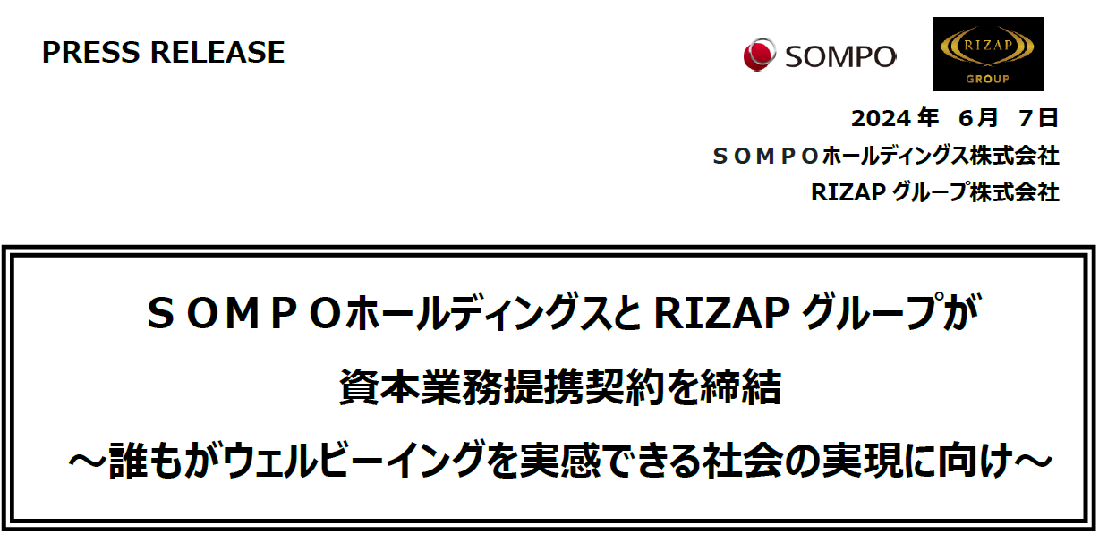 なお、本資本業務提携に関しては両社で2024年7月1日に共同記者会見を開催(出席者 SOMPOホールディングス:グループCEO 奥村 幹夫、RIZAPグループ:代表取締役社長 瀬戸 健)させていただく予定です。