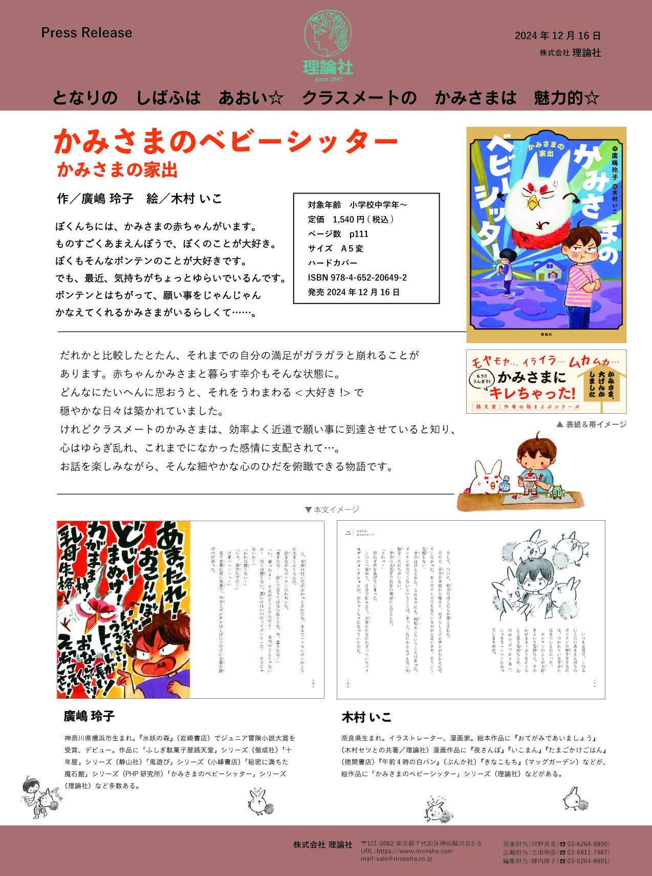 株式会社理論社(本社:東京都千代田区、代表取締役社長:鈴木博喜)は『かみさまのベビーシッター かみさまの家出』(作:廣嶋玲子 絵:木村いこ)を2024年12月18日(水)に発売いたしました。