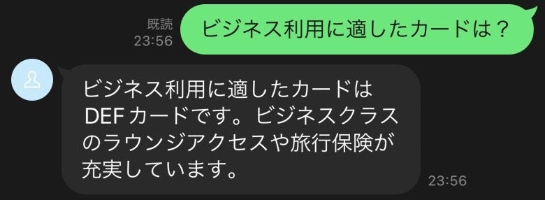 別のユーザーが「ビジネス利用に適したカードは?」と質問すると、Botは「DEFカードはビジネスクラスのラウンジアクセスや旅行保険が充実しており、ビジネスユーザーに最適です」と示します。