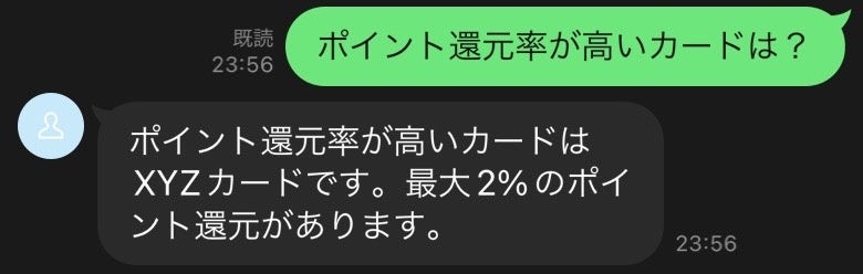 ユーザーが「ポイント還元率が高いカードは?」と尋ねると、Botは「XYZカードは国内外のショッピングで最大2%のポイント還元があります」と提案します。