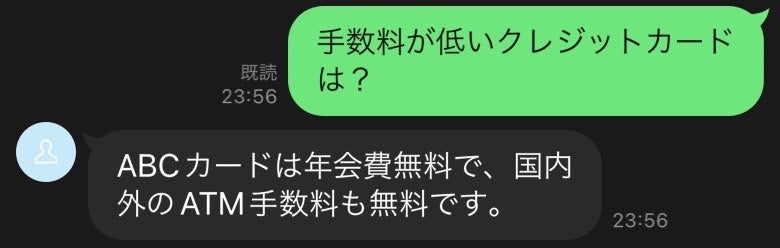 「手数料が低いクレジットカードは?」という質問に対し、Botは「ABCカードは年会費無料で、国内外のATM手数料も無料です」と回答します。