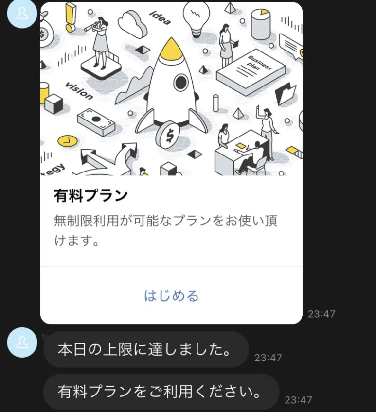 設定すると、1日の無料メッセージ数を超えたタイミングで「本日の上限に達しました」と表示され、有料プランへ自動で案内します。