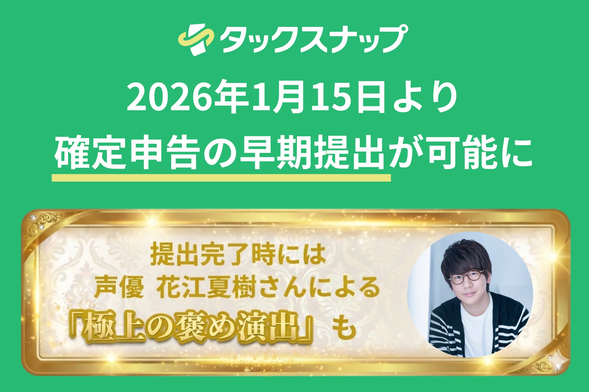「タックスナップ」、2026年1月15日より確定申告の早期提出が可能に。提出完了時には声優・花江夏樹さんが「極上の褒め演出」で称賛。