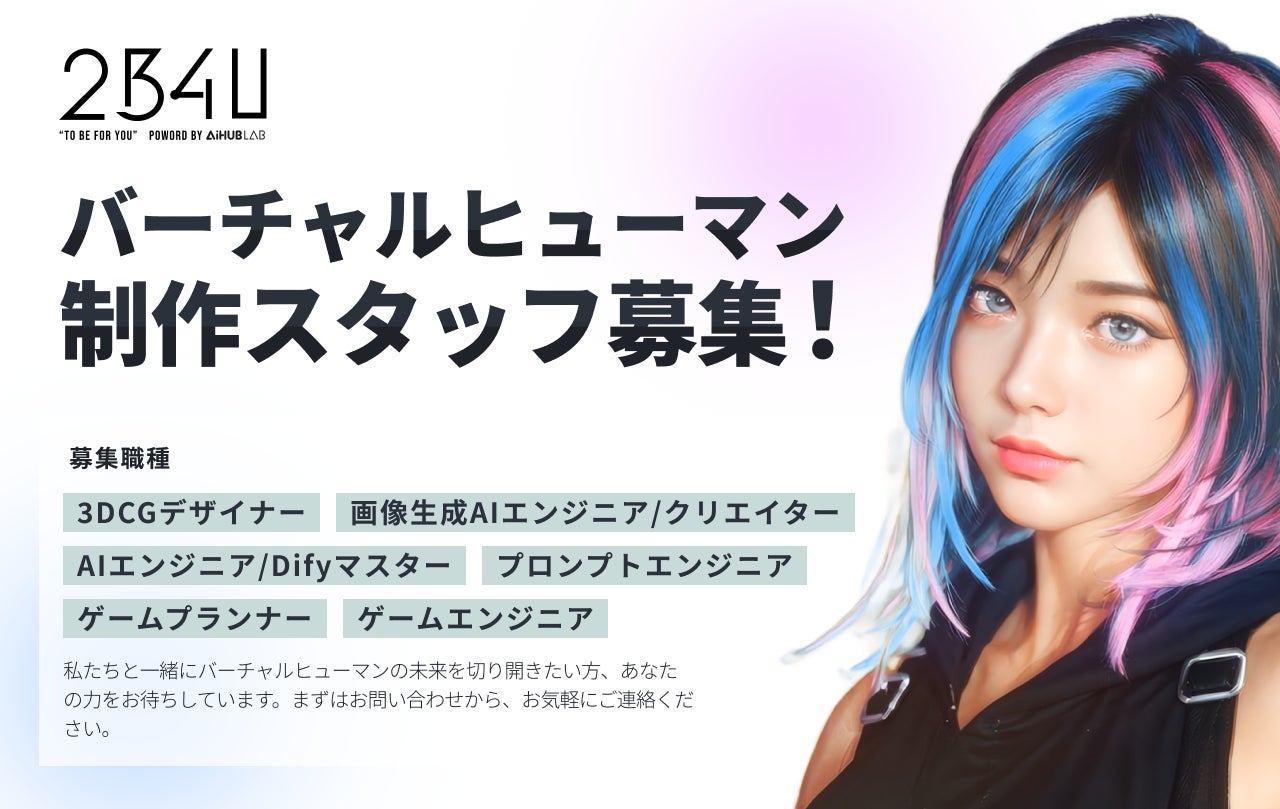 AiHUB株式会社(本社:東京都千代田区、代表取締役:園田れい)は、AIキャラクター/エージェント(及び、AIバーチャルヒューマン/デジタルヒューマン)開発に特化したクリエイティブスタジオ「2B4U(トゥービーフォーユー)」を始動いたしました。
