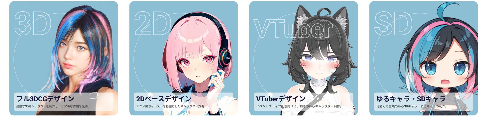 さらに、キャラクターのビジュアルは、人間に近い3DCG、VTuber風の2Dデザイン、親しみやすいゆるキャラ風デザインなど、幅広いスタイルからお選びいただけます。お客様のご要望に合わせ、世界に一つだけのバーチャルヒューマンをお届けします。