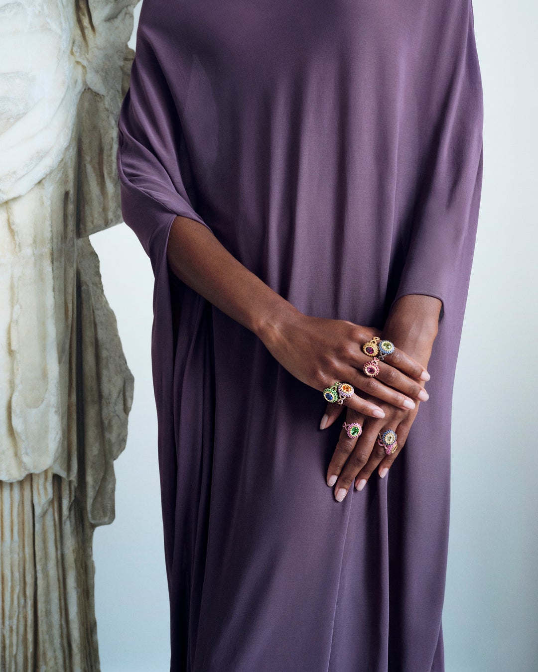イエローゴールドに色鮮やかなカラーストーンを組み合わせ、それぞれのリングには個性を映す色彩と名が与えられています。