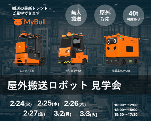 第一実業株式会社(本社:東京都千代田区、代表取締役 社長執行役員:船渡雄司、以下「当社」)は、エレクトロニクス事業本部が展開するサービスブランド、物流自動化ソリューション「LOGITO」(※)が提供する、日本マイブルロボットテクノロジー株式会社(以下「MyBull社」)の製品である屋外搬送ロボットの見学会を開催いたします。