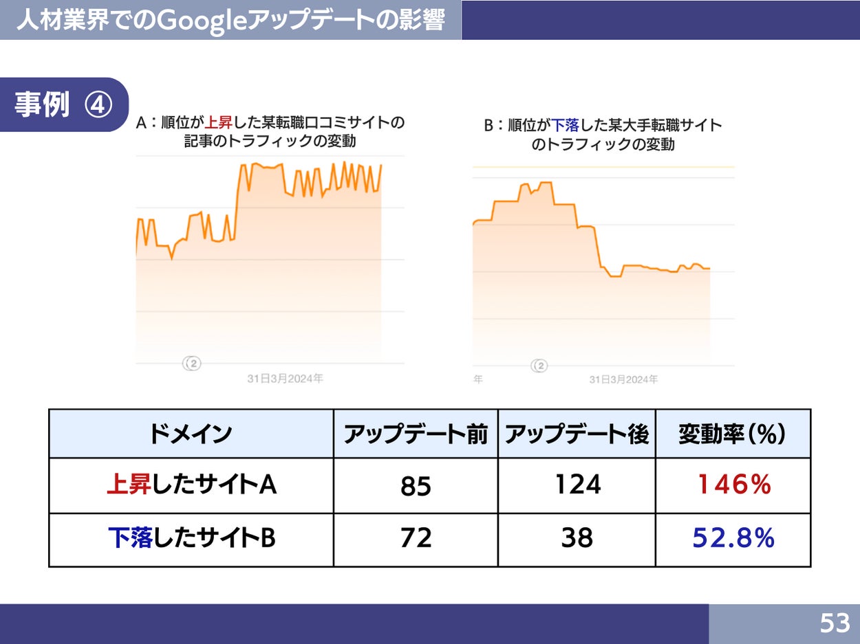 2024年4月に完了したGoogleアップデートにより人材業界の各サイトのトラフィックに変動が起きています。今回のアップデートでは、以下の内容を反映しているサイトがポジティブな影響を受けています。