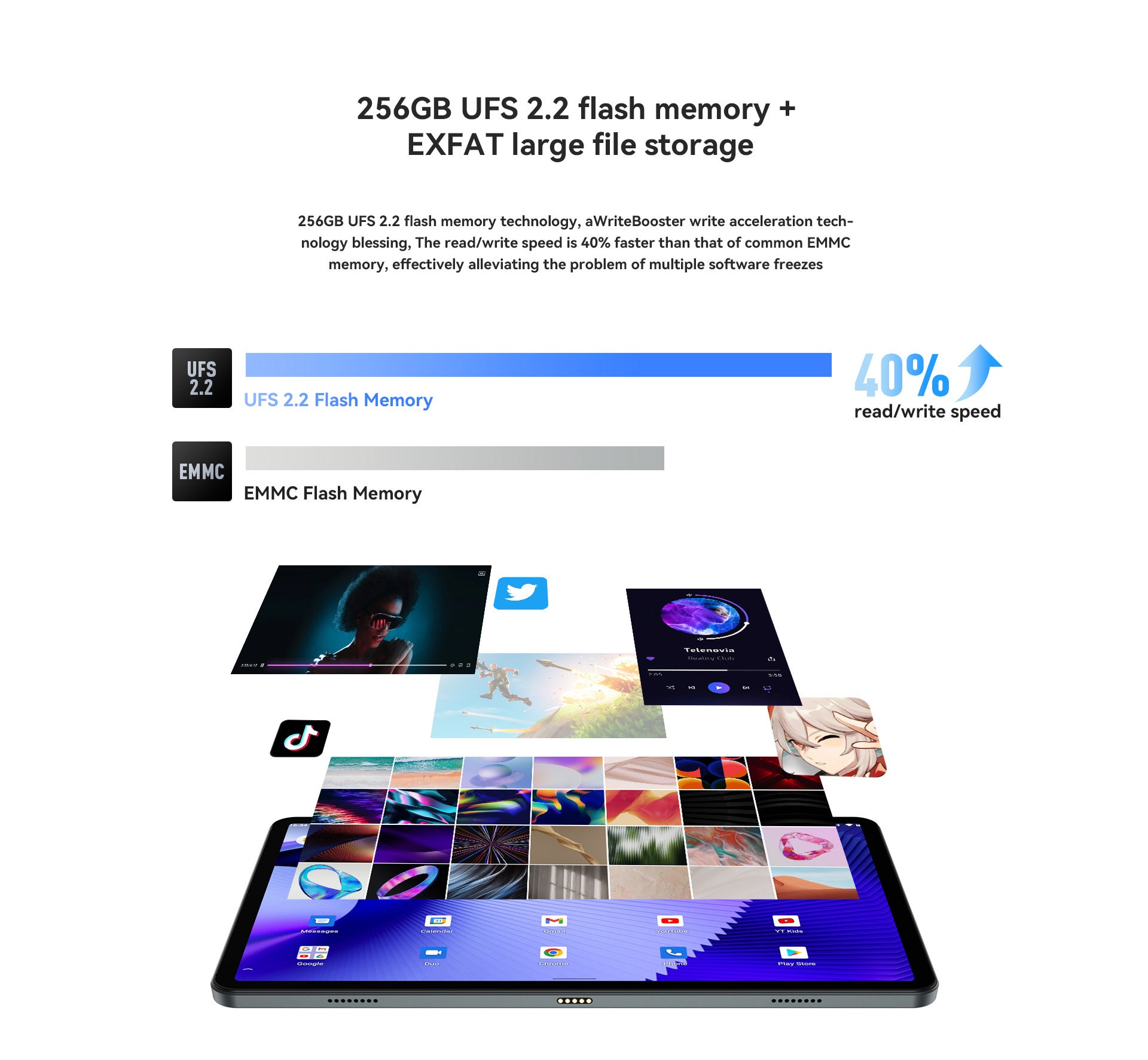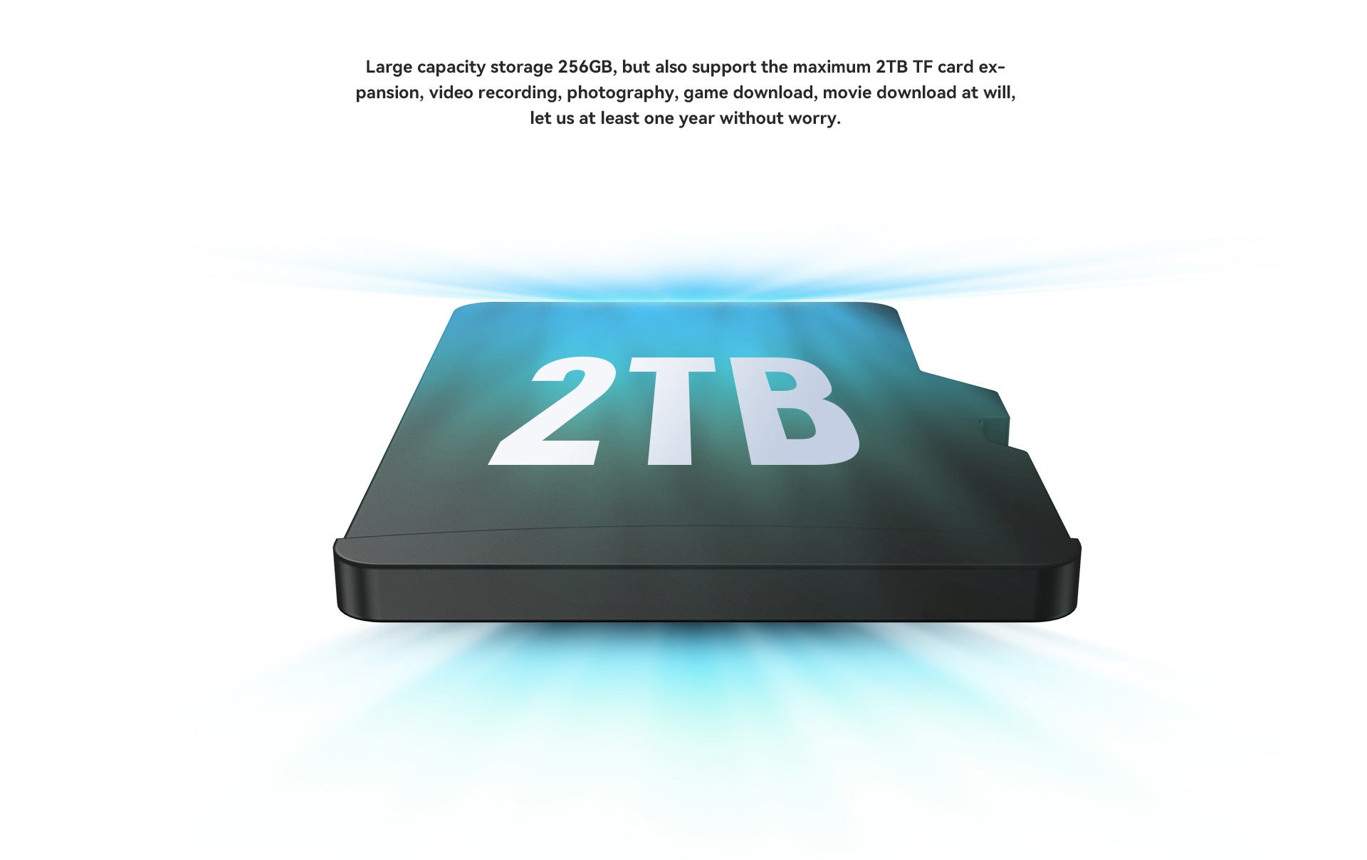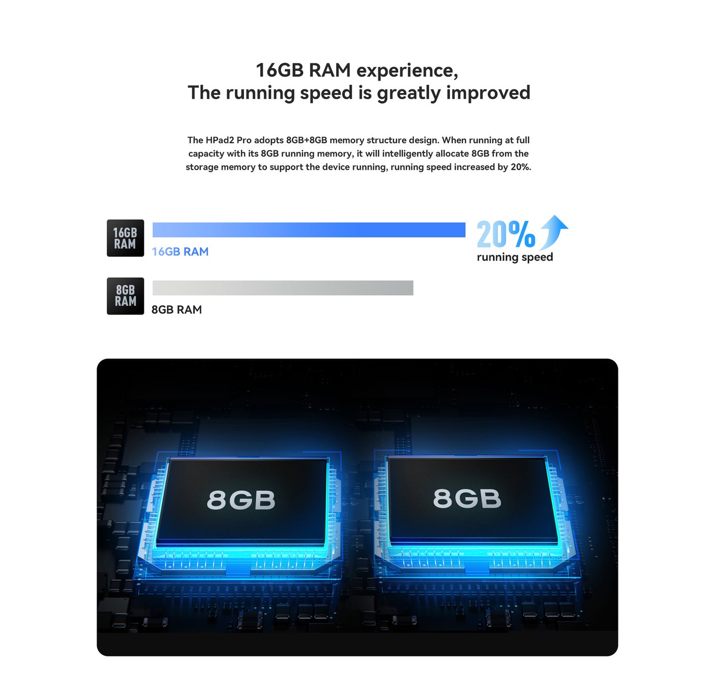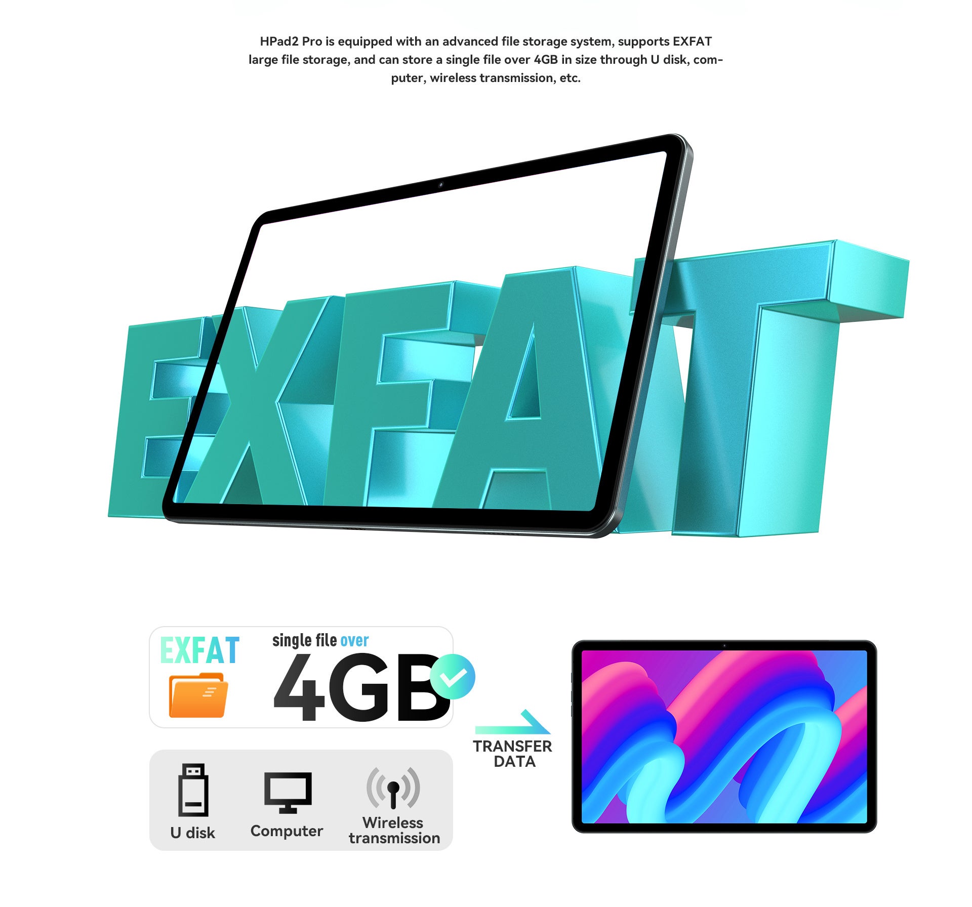 Hpad2 Proは8GB+8GBのメモリ構成で、本体には8GBのランニングメモリが搭載されています。フル負荷時には、ストレージメモリから8GBのメモリがスマートに割り当てられ、デバイスの実行をサポートし、実行速度が20%向上します。256GBのUFS 2.2フラッシュストレージ技術とaWriteBooster書き込み加速技術により、一般的なEMMCメモリよりも読み書き速度が40%高速化され、複数のソフトウェアの遅延を効果的に緩和します。256GBの大容量ストレージに加えて、最大2TBのTFカード拡張もサポートしており、ビデオの録画、写真撮影、ゲームや映画のダウンロードなど、自由な使用が可能です。Hpad2 Proは先進的なファイルストレージシステムを搭載し、EXFAT大容量ファイルストレージをサポートしており、USBフラッシュドライブ、コンピュータ、ワイヤレス転送などの方法で4GB以上の大きさのファイルを保存できます。
