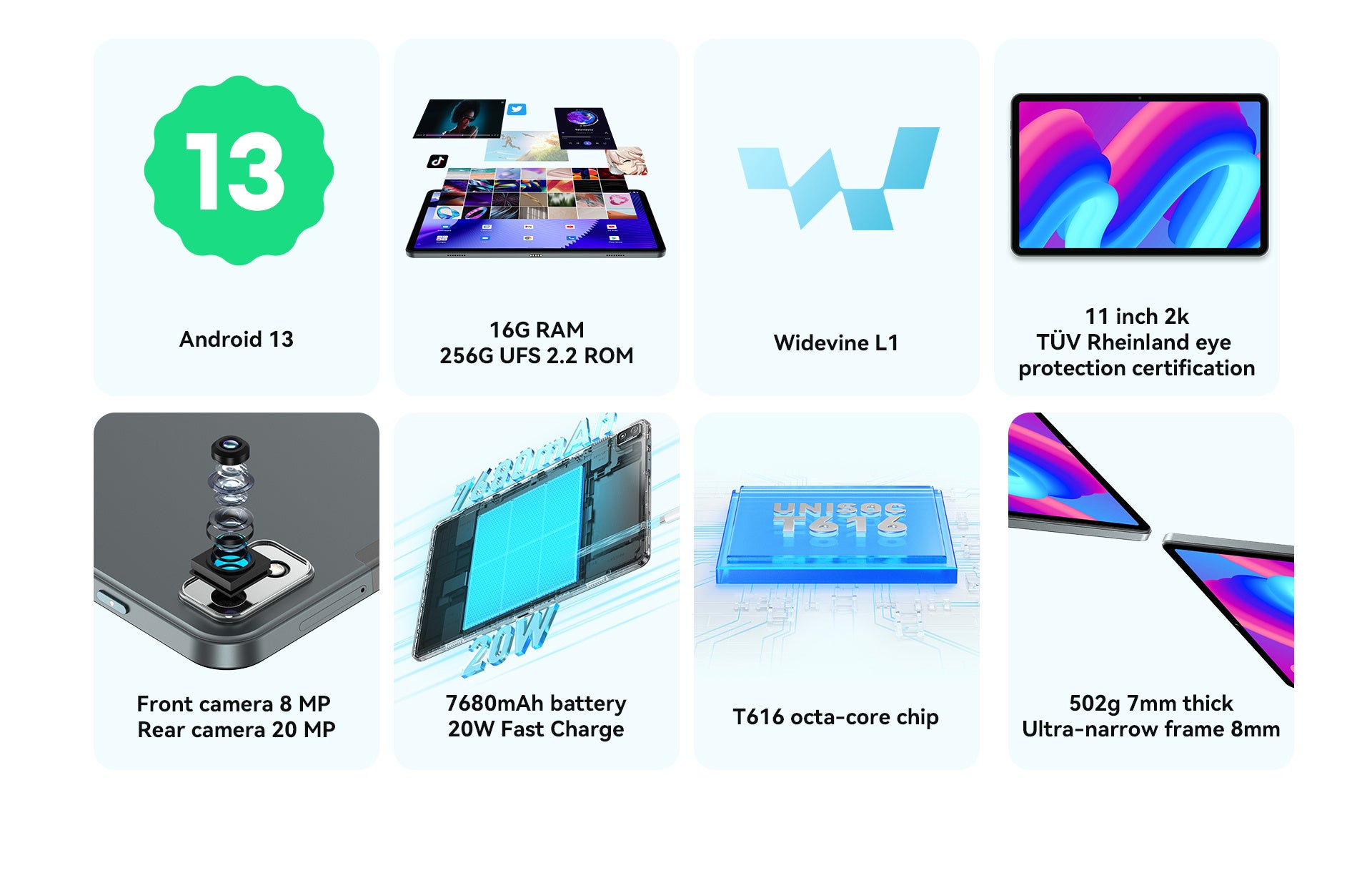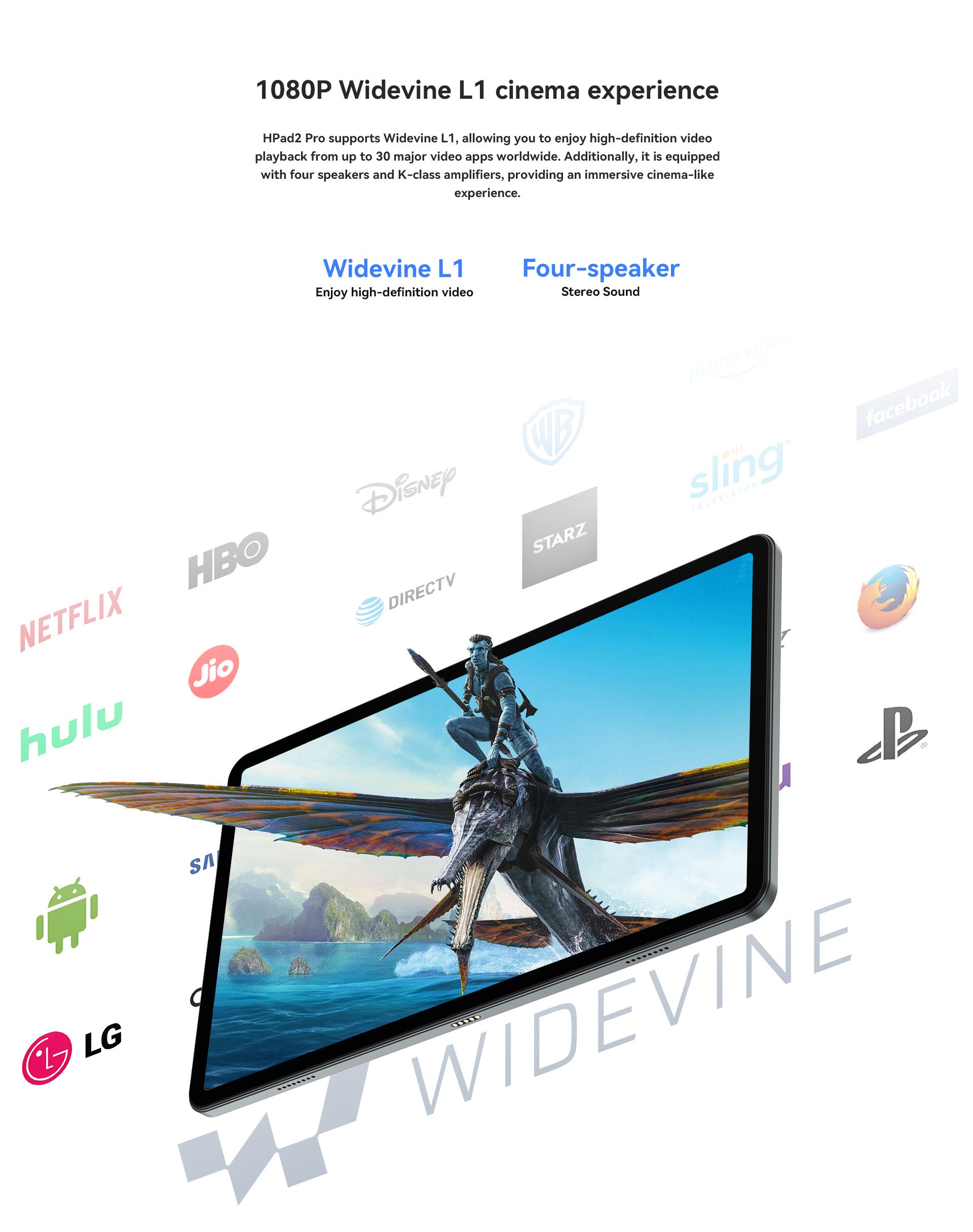 Hpad2 Proは11インチの高解像度ディスプレイを採用しており、オリジナルの画質や色彩をより良く表示します。11インチの2K(2000*1200)の高精細全面ディスプレイで、1670万色を表示できます。8mmの超薄額縁と92.2%の超大画面占有率を備えています。TÜV Rheinlandのアイケア認証も取得しております。さらに、Hpad2 ProはWidevine L1もサポートしており、30以上の主要なビデオアプリでハイビジョン動画を快適に楽しむことができます。また、4つのKクラスアンプによるスピーカーも搭載されており、シアターのような没入体験ができます。