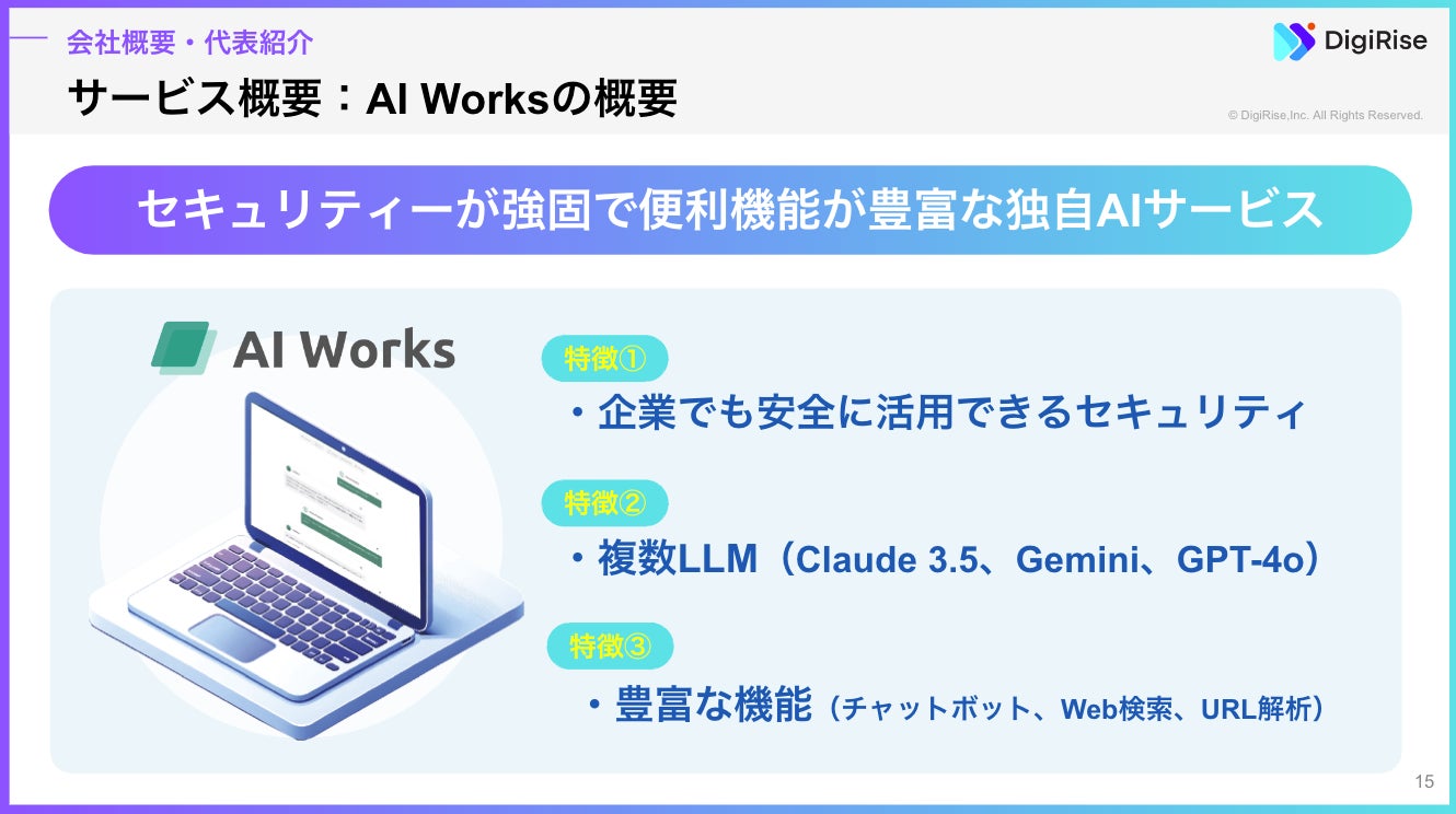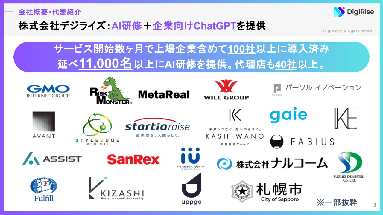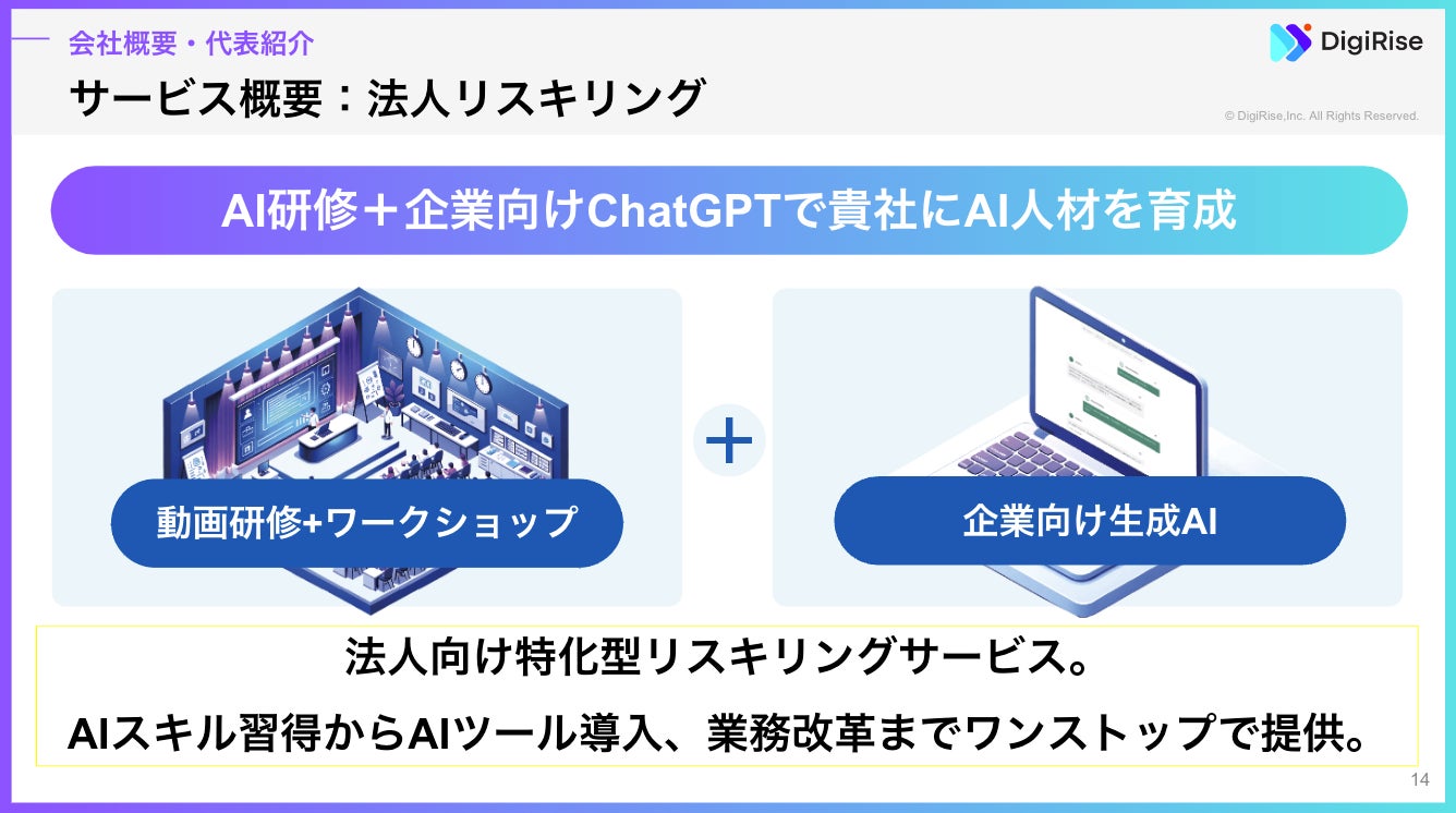 株式会社デジライズは「AIの利便性と感動を全ての人に届ける」をビジョンとして2023年に事業を開始しました。「法人リスキリング®︎」というAI研修(動画学習+ワークショップ)と自社開発の企業向けChatGPT「AI Works」を提供するサービスを、上場企業を筆頭に多くの企業様に導入を進めております。