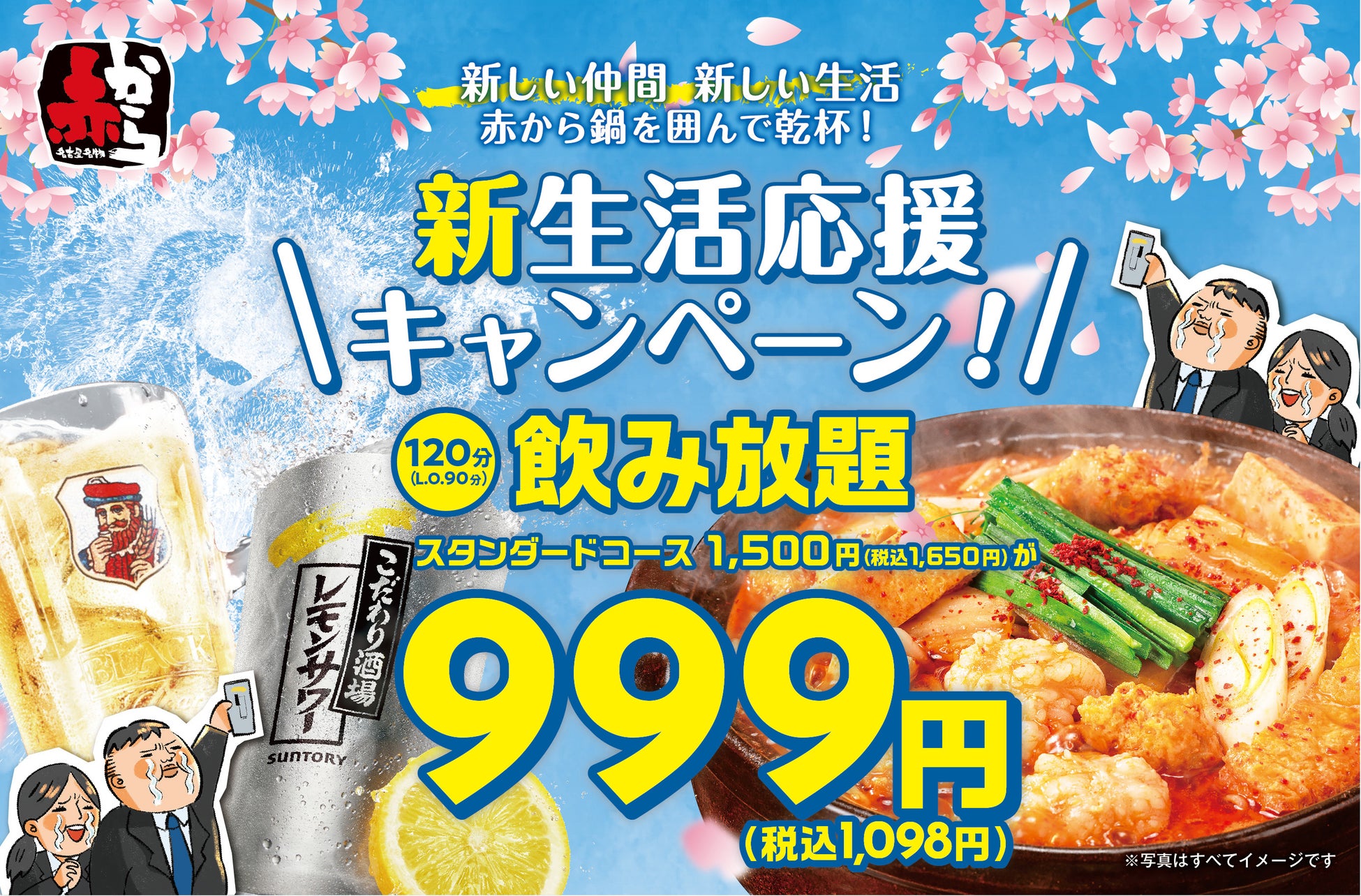 【赤から】が「新生活応援キャンペーン」を4月1日(火)より開催!飲み放題を999円で提供!!