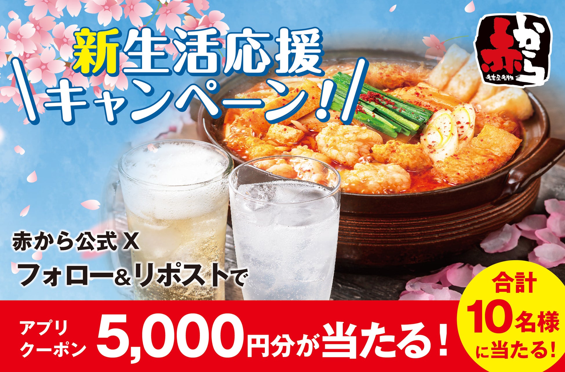 赤から公式Xアカウントをフォローして「赤から新生活応援キャンペーン」の投稿をリポストすると、抽選で10名様に「5,000円OFFのクーポン」が当たります。1日1回挑戦できるので、ぜひ応募してください。