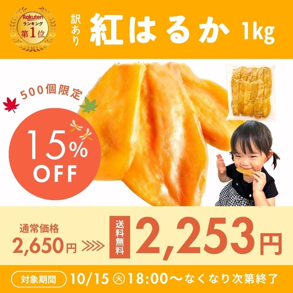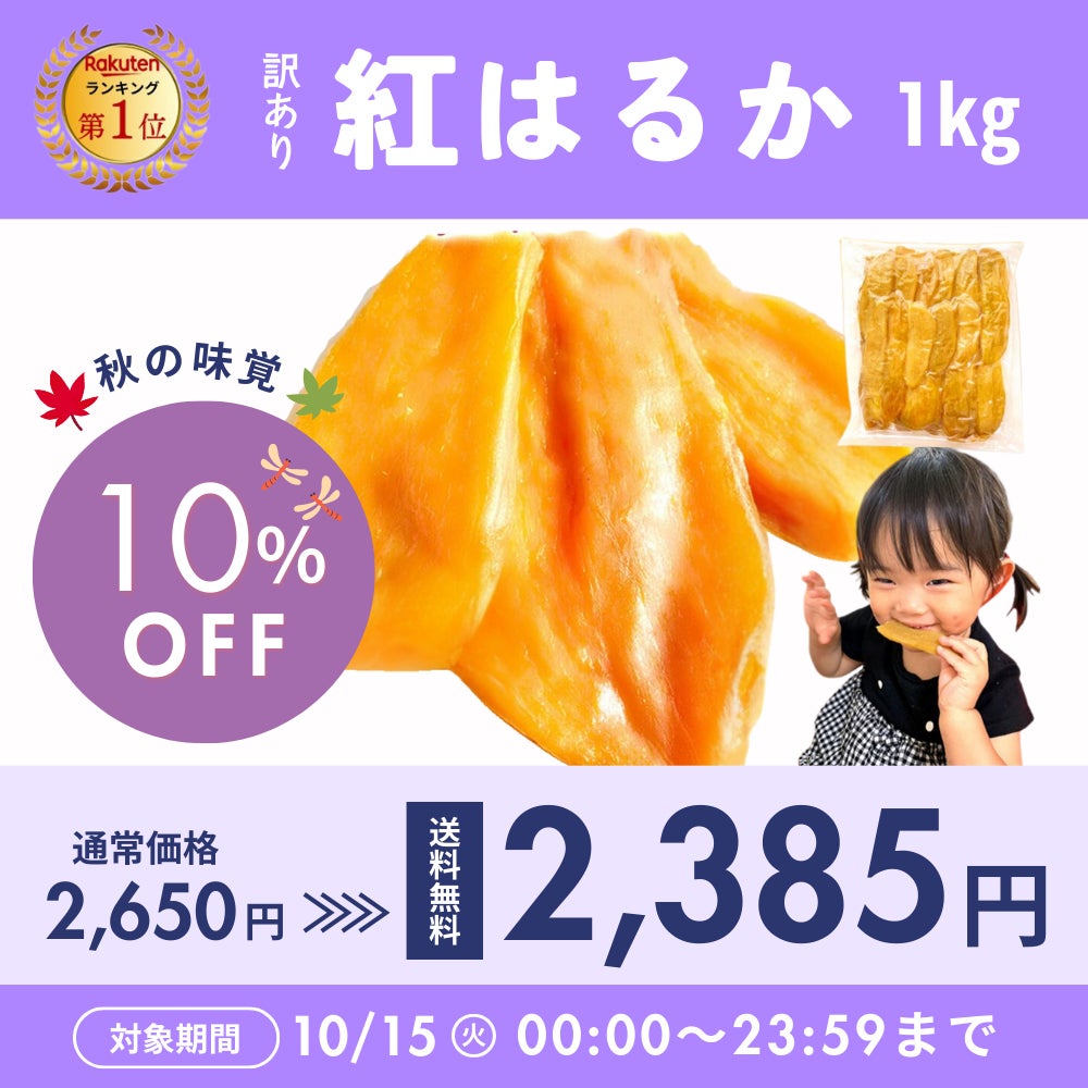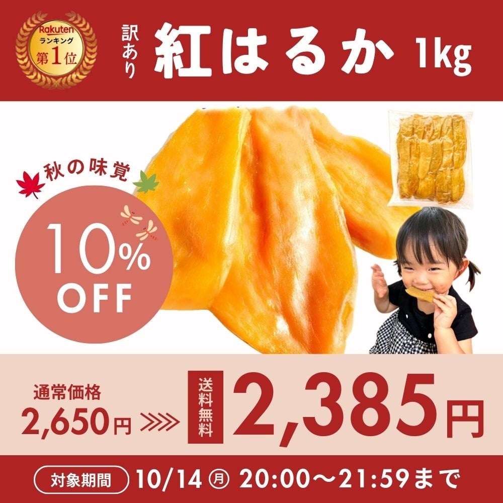 創業からわずか2年で、ネット通販で1日1万件以上の注文を記録し、楽天市場で総合ランキング1位を獲得した「芋國屋」。第2弾楽天お買い物マラソンに向けて、10月14日より『人気No.1 訳あり紅はるか干し芋 1kg』をセール価格にて3回にわたって販売いたします。※なお、割引商品には10%OFFクーポンはご利用いただけませんのでご注意ください。