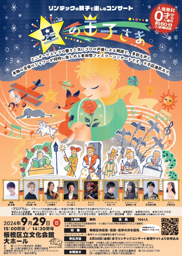 区内に本社があるリンテック株式会社の協力を得て、「リンテックの親子で楽しむコンサート」を9月29日(日)に開催します。手遊び歌等一緒に歌って参加できる曲からクラシックの名曲までもりだくさんのミニオーケストラ演奏や、声優の梶 裕貴さんによる「星の王子さま」の朗読など、子どもから大人まで楽しむことができるファミリーコンサートです。