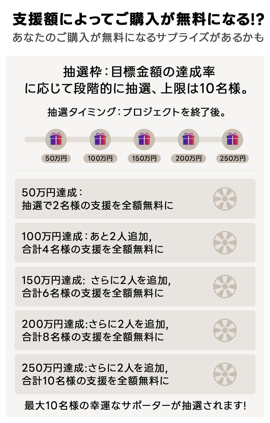 プロジェクトはまだ進行中ですので、今ご支援いただければ当選するチャンスがまだあります。