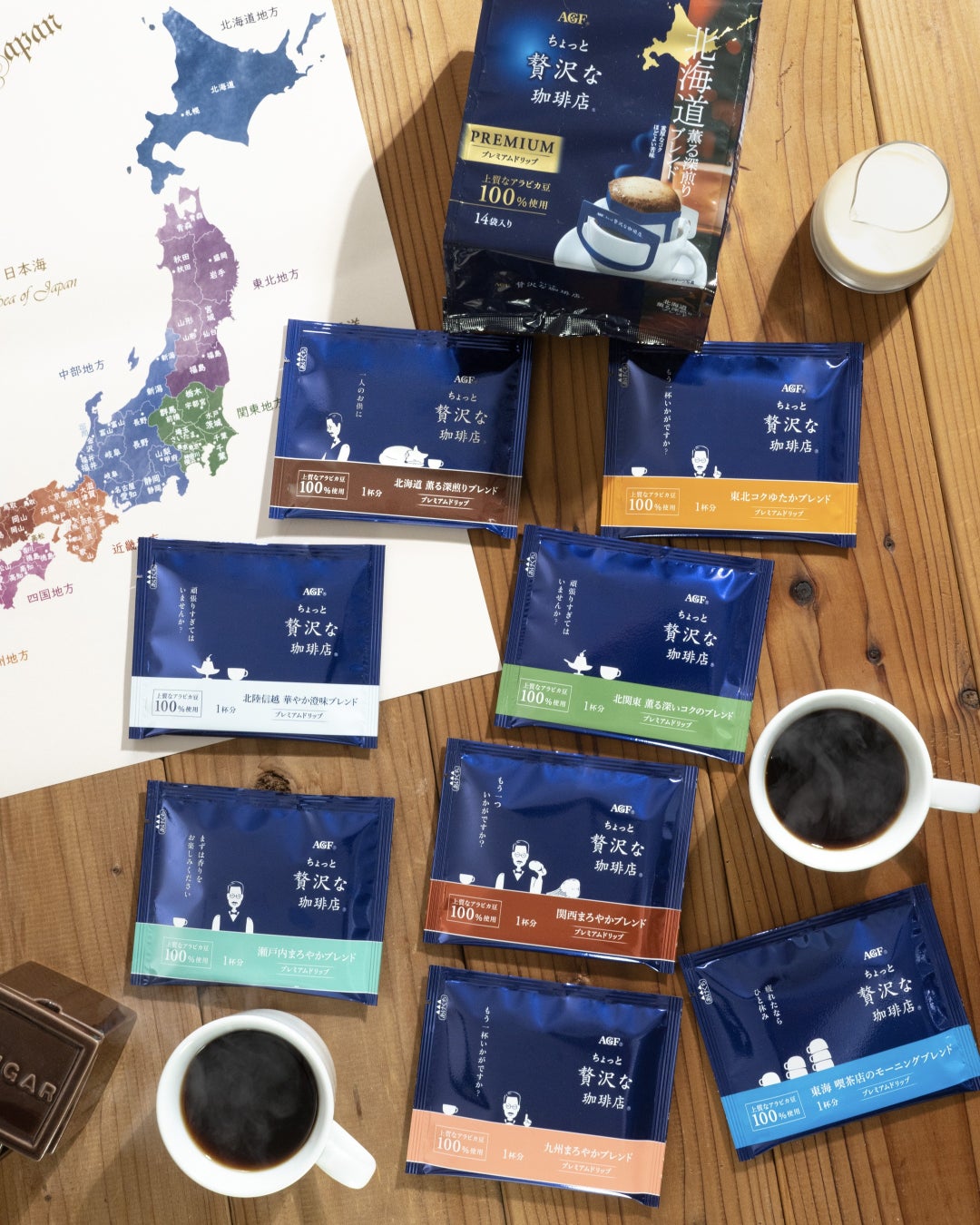 2021年より《「ちょっと贅沢な珈琲店®」パーソナルレギュラーコー ヒー》《「ちょっと贅沢な珈琲店®」スティックブラック(個包装タイプのインスタントコーヒーまたはインスタントコーヒー調製品)》各種に心を癒やしてくれるマスターのイラストとメッセージ入りのデザインを開始。コーヒーを飲む瞬間にマスターがことばをかけてくれる情景を表現し、実際に珈琲店で飲むような体験価値をお届けしています。また地元ブレンドシリーズの展開では、各地域を表す象徴的なモチーフとメッセージの展開にもこだわっています。