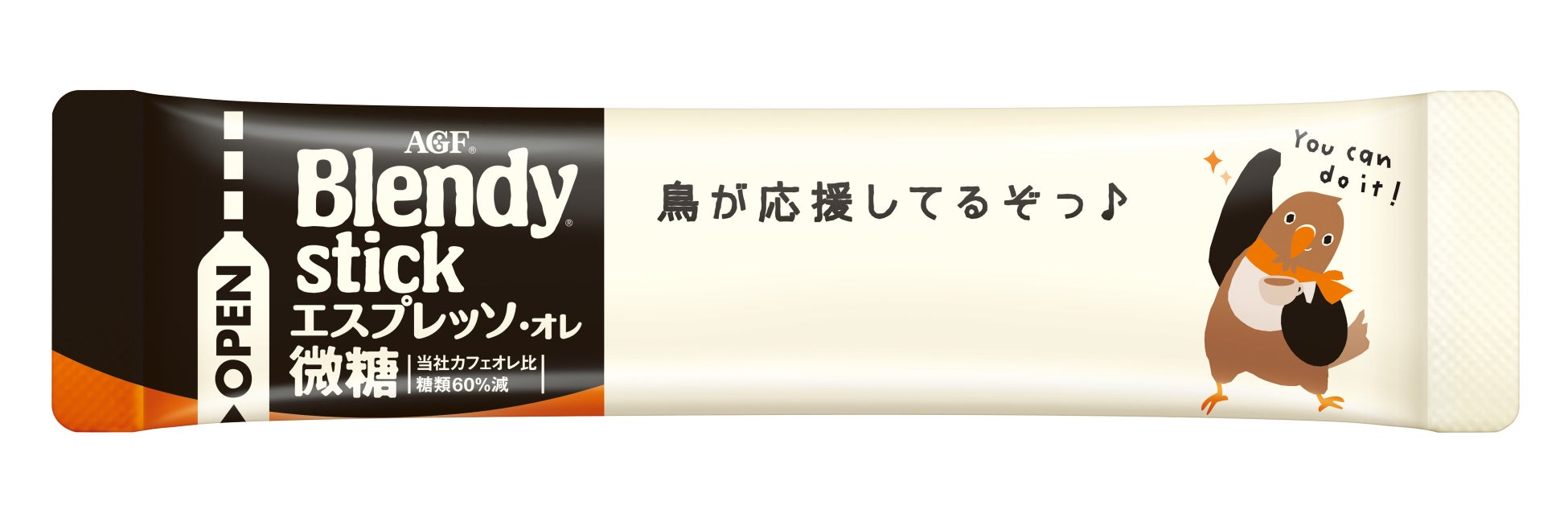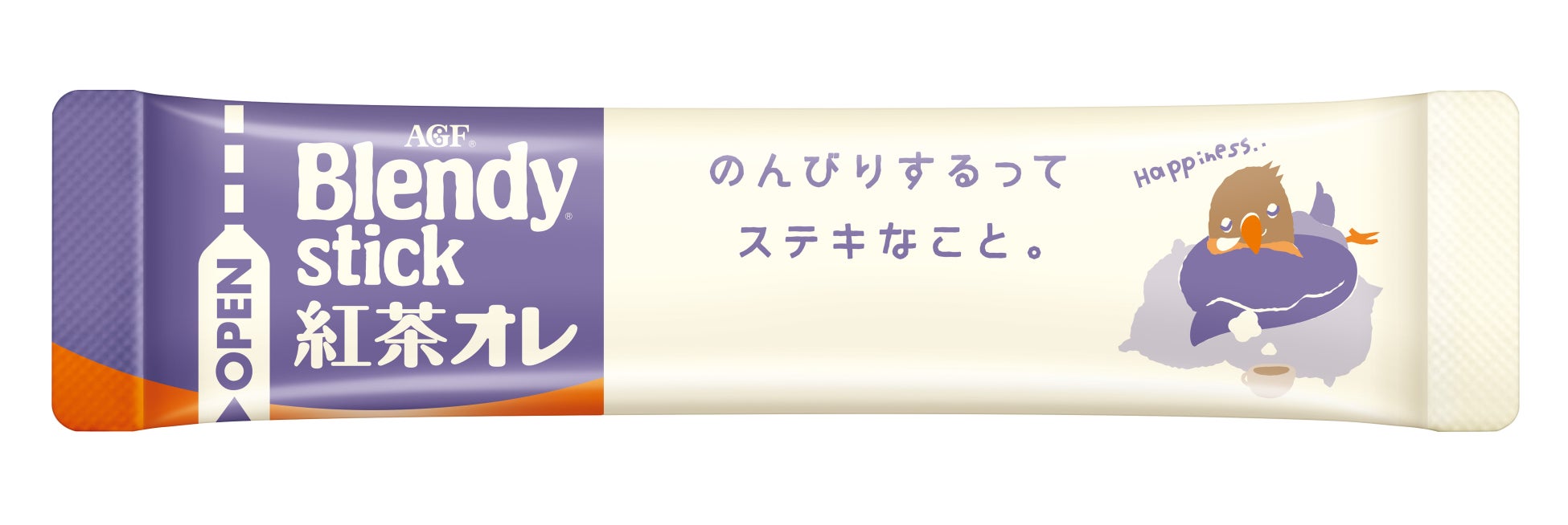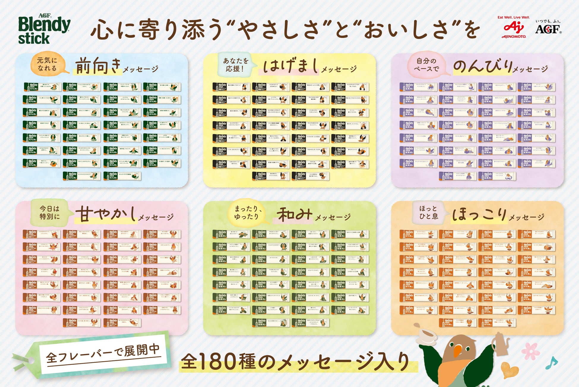 お客様に少しでも明るく前向きな気持ちになっていただけるよう、2016年から《「ブレンディ®」スティック》シリーズの一部のフレーバーで一言メッセージデザインを開始しました。2021年からは、より多くのお客様の心に寄り添いたいという想いから、対象を全フレーバーに広げて展開。フレーバーごとの飲用シーンの違いをもとにした「前向き」「はげまし」「のんびり」「甘やかし」「和み」「ほっこり」の6テーマ全180種のメッセージとアーリーバードのイラストが入った個包装デザインでお届けしています。